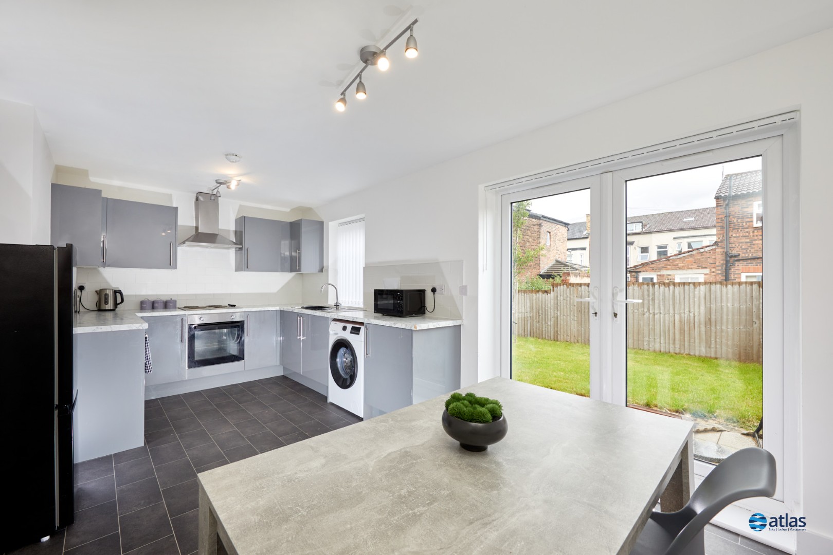 - Contemporary Open Plan Kitchen Diner with French Doors to Garden