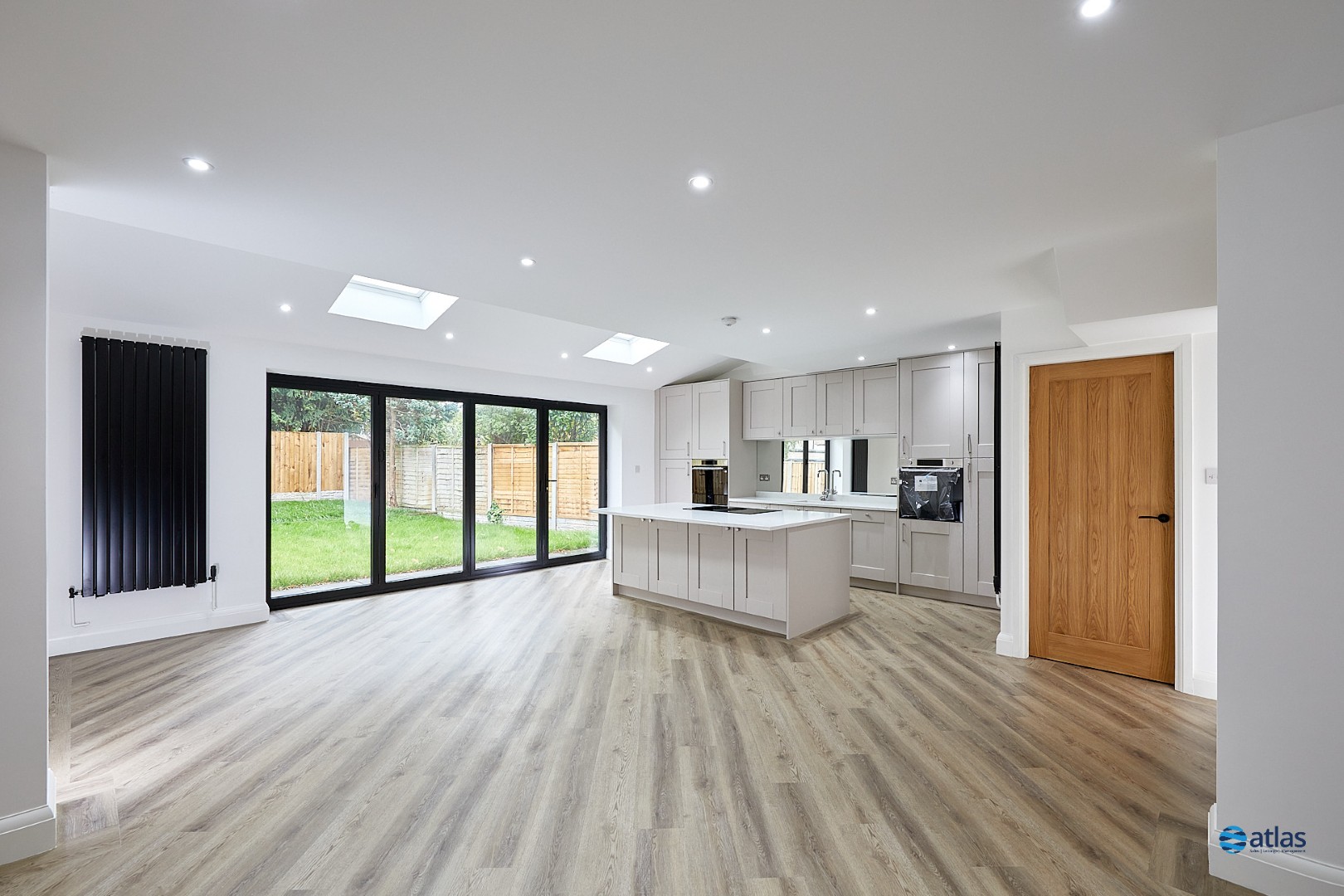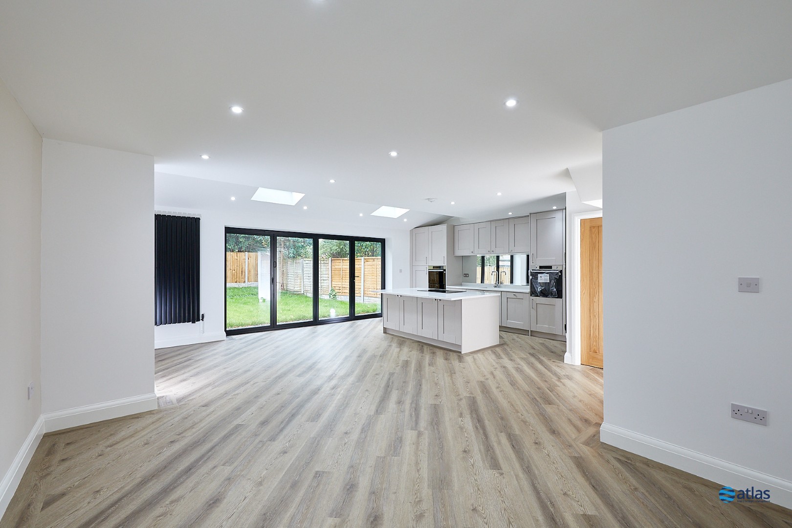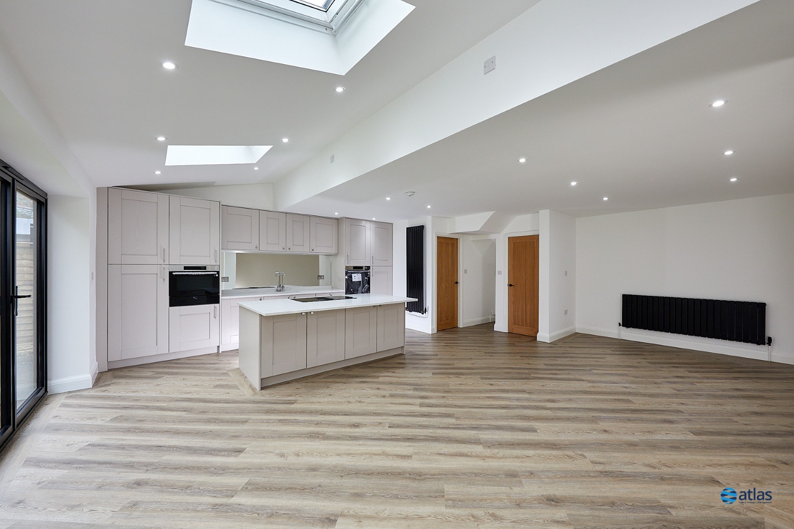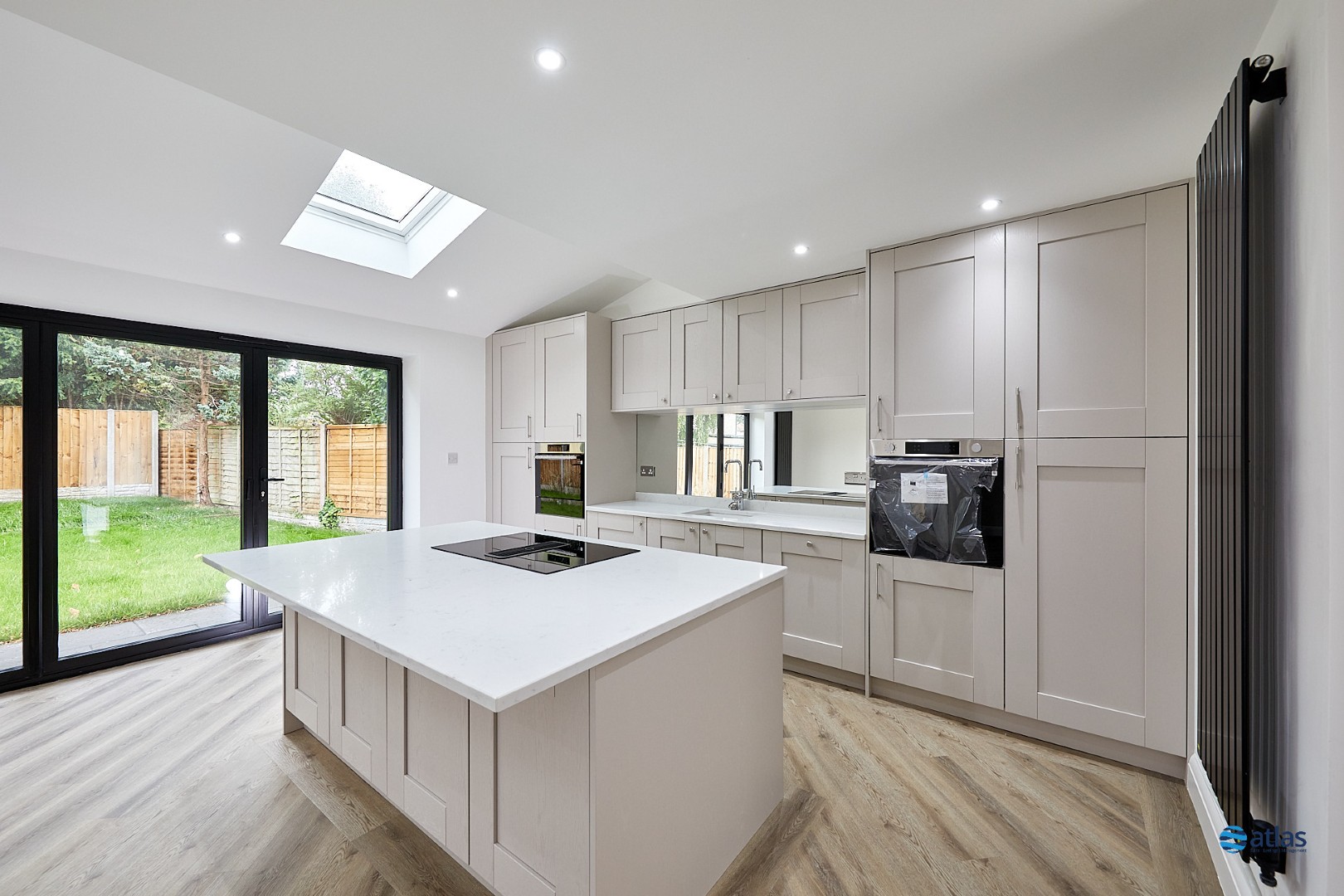 - Spacious Open-Plan Kitchen and Dining Area with Quartz Worktops, Bi-Fold Doors and Skylights