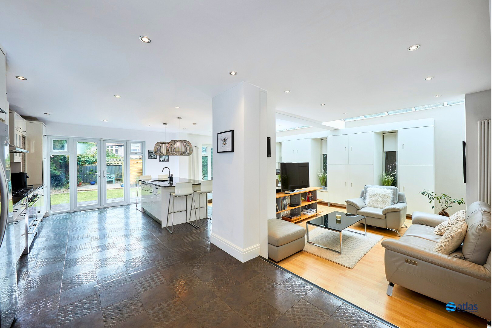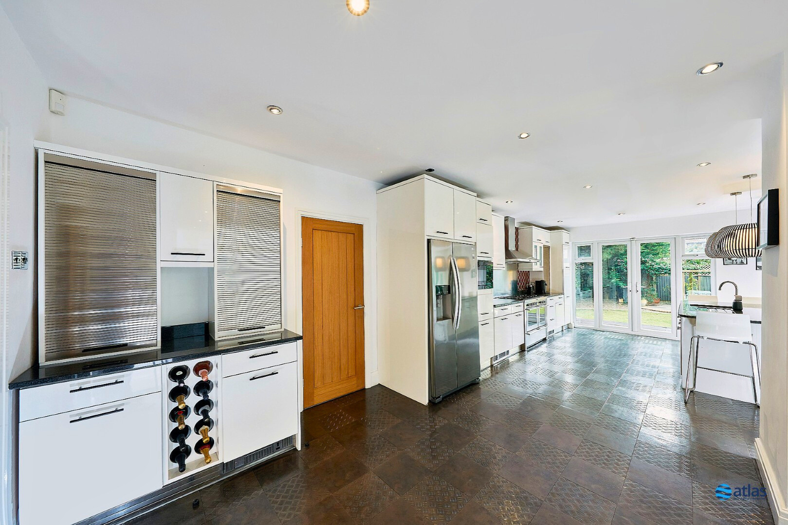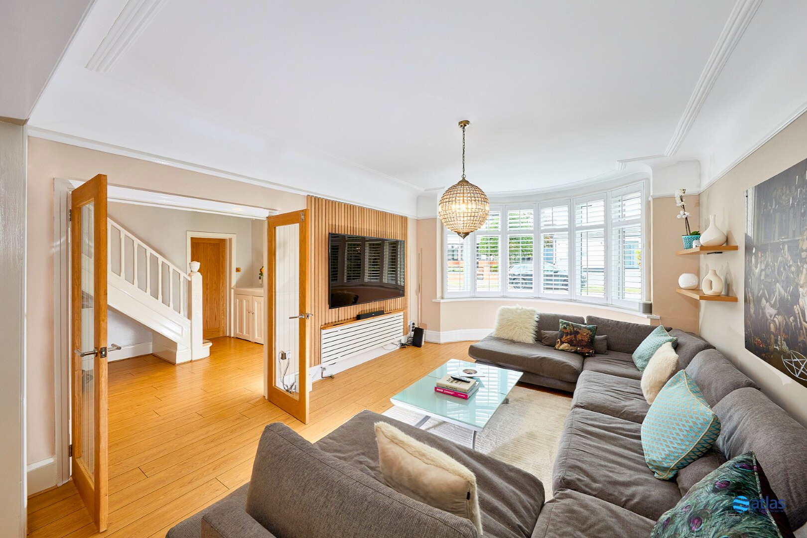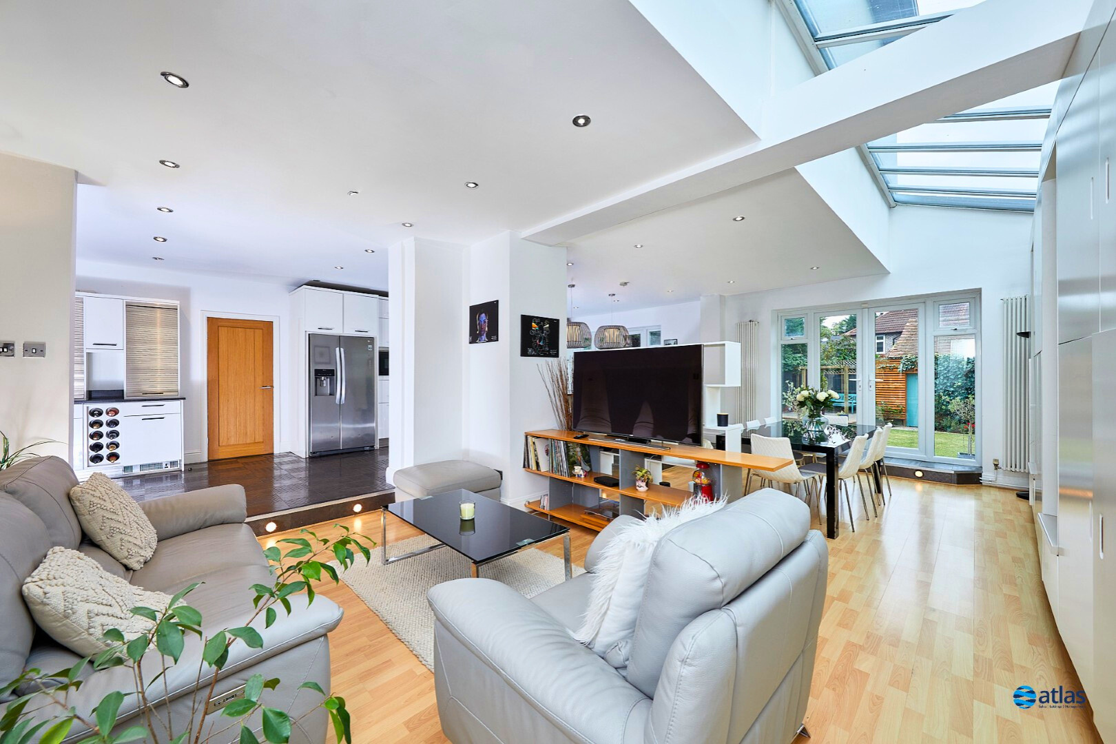 The ground floor features a welcoming hallway leading to a generous living room with a charming bay window and double doors opening to the rear garden. The home’s heart is a spacious open-plan kitchen and living area, flooded with natural light and equipped with modern integrated appliances. Completing the ground floor are a convenient office, utility room, and a downstairs W.C., making the layout exceptionally functional.