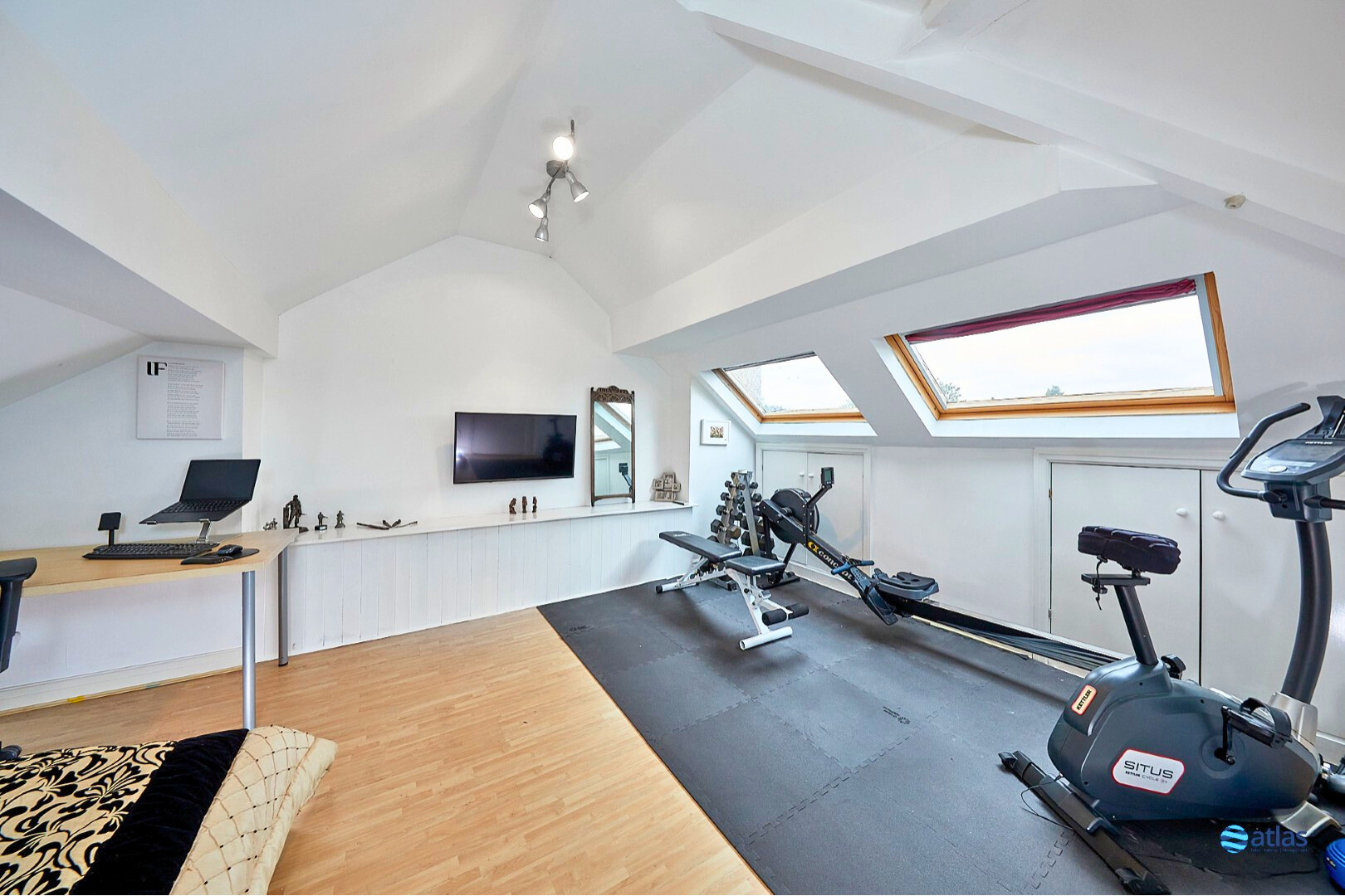 On the first floor, five double bedrooms await, including a master suite with a fitted wardrobe and en-suite bathroom. Two further contemporary bathrooms serve the remaining bedrooms, providing comfort and convenience for family life. The second floor houses a sixth bedroom, playroom, or hobby space.