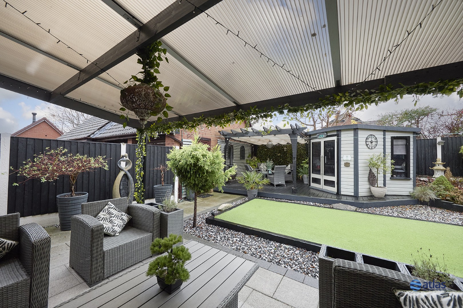 Externally, the property continues to impress. Beautifully maintained front and rear gardens provide a tranquil setting for relaxation or outdoor dining. A detached double garage, accompanied by a private driveway finished with elegant porcelain tiles, offers excellent off-road parking, ample storage, and an attractive, high-quality approach to the home.