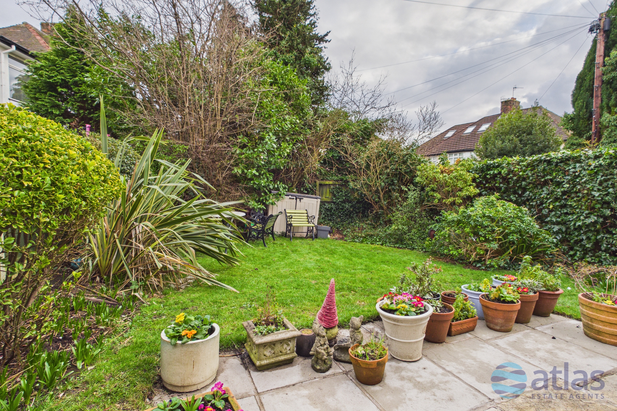 Outside, the mature rear garden is a private sanctuary, featuring a spectacular blossom tree, an array of shrubs, and a patio area perfect for alfresco dining and entertaining. A dedicated driveway provides parking for two vehicles.