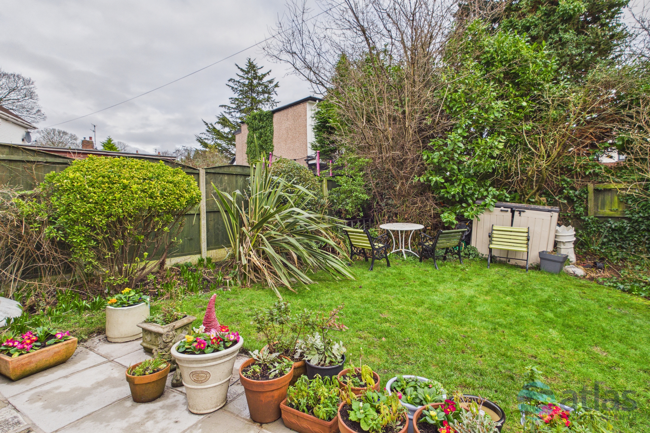 - Mature Rear Garden with a Stunning Blossom Tree, an Array of Shrubs, and a Patio Area Ideal for Outdoor Dining and Entertaining.