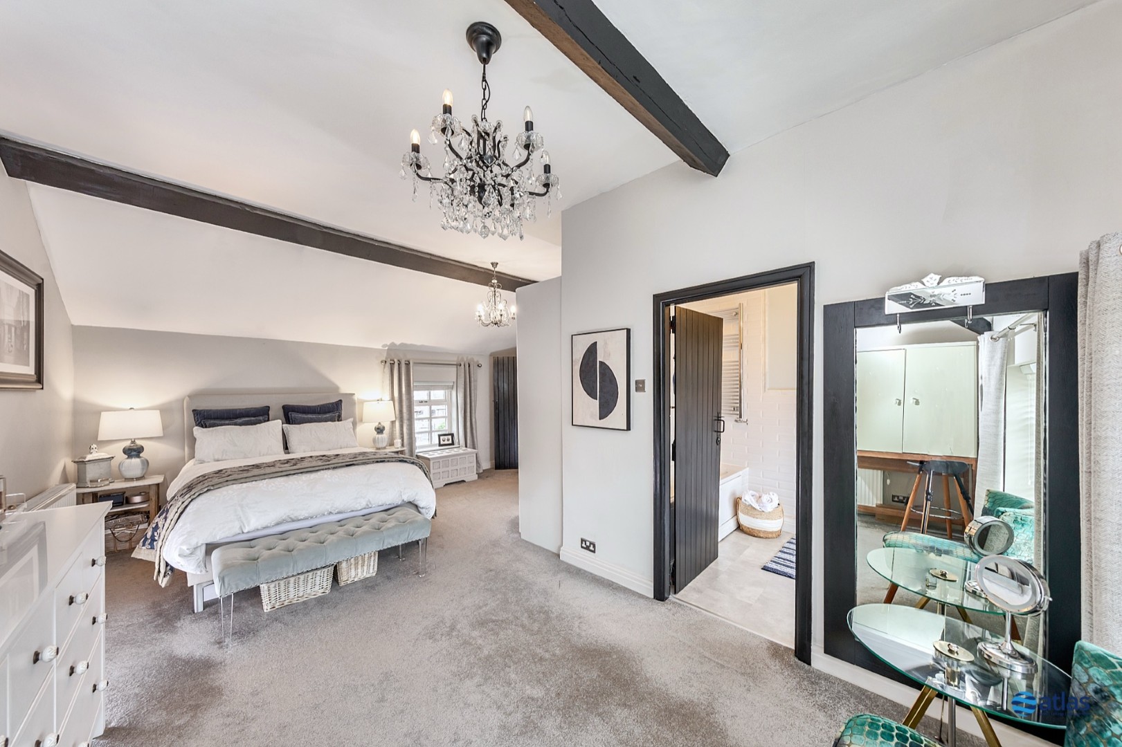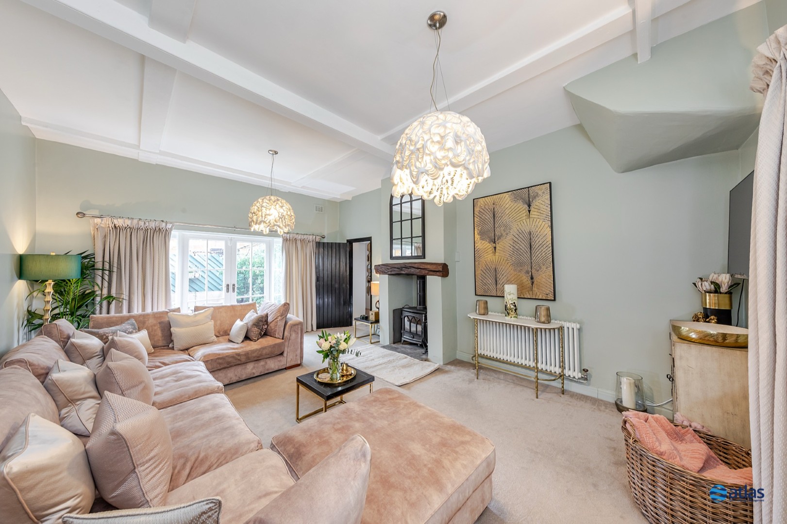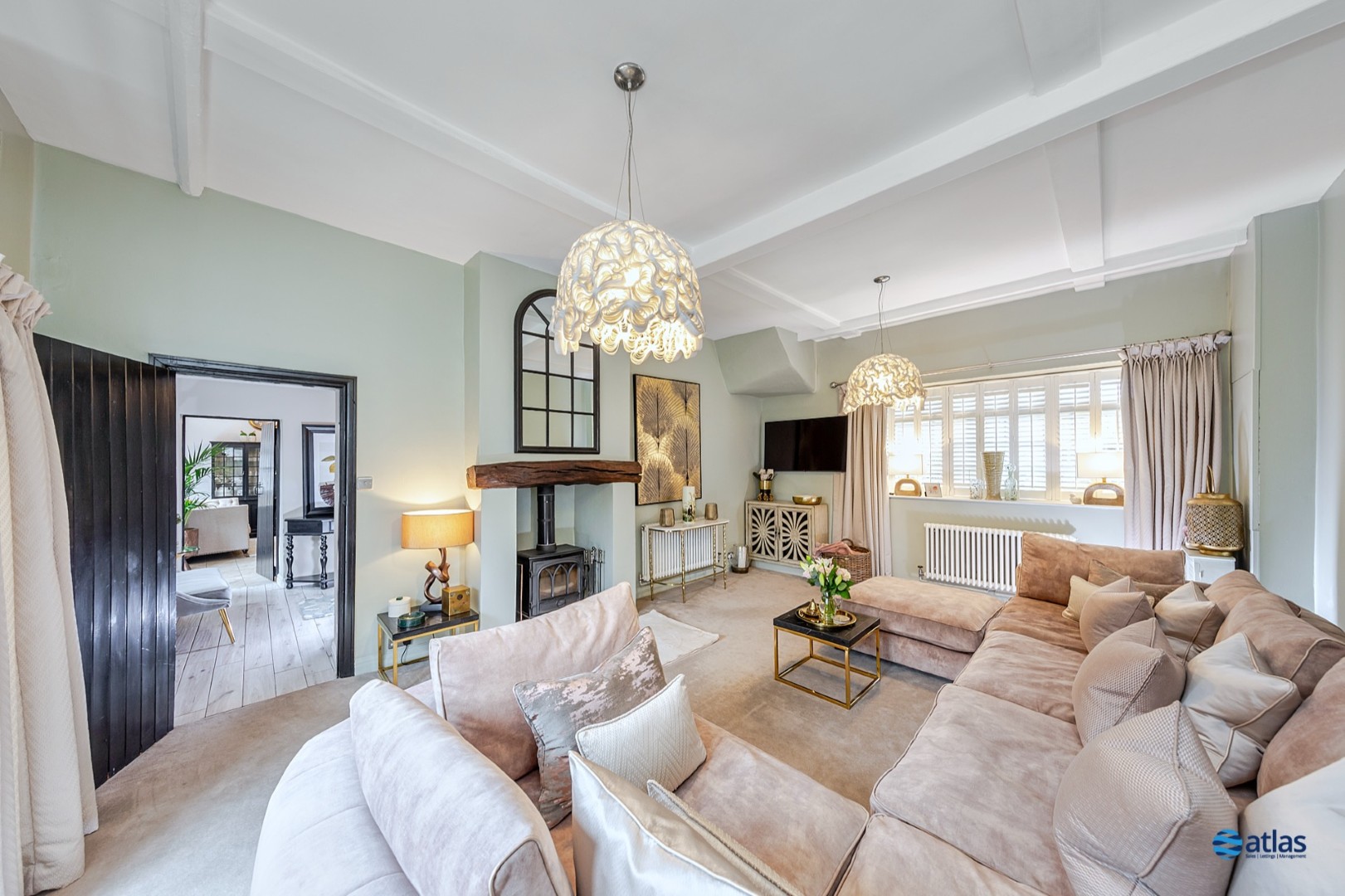 - Expansive, Refined Reception Room with Plush Beige Carpeting, a Charming Log Burner, and Striking Beamed Ceilings Full of Character.