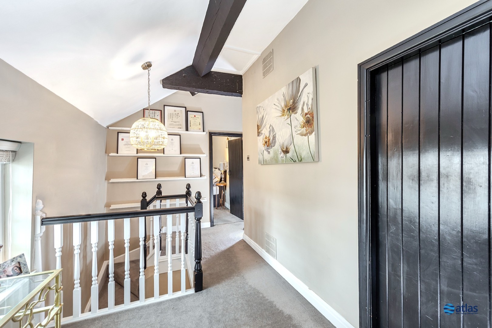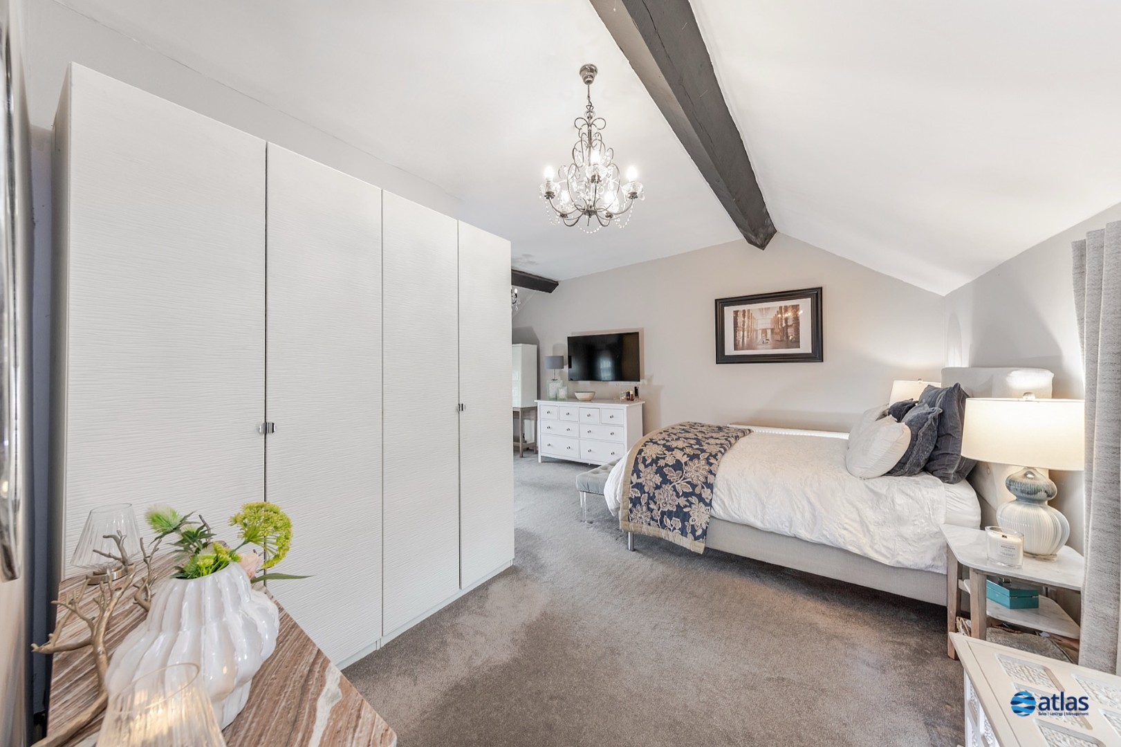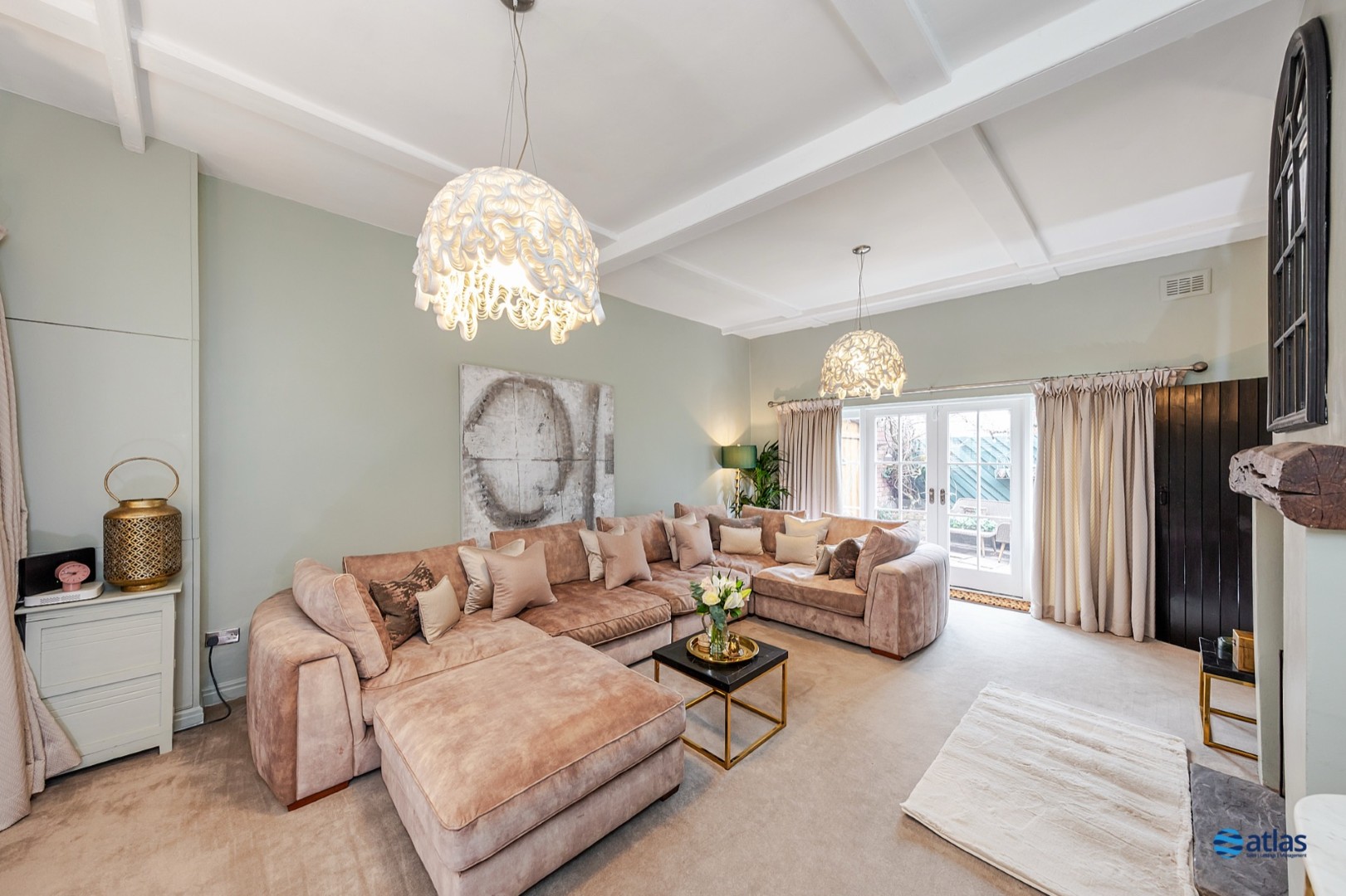 - Expansive, Refined Reception Room with Plush Beige Carpeting, a Charming Log Burner, and Striking Beamed Ceilings Full of Character.