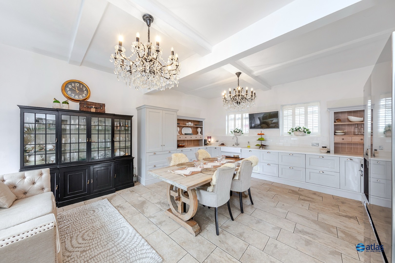The expansive reception room exudes refinement and warmth, with plush beige carpeting underfoot, a charming log burner, and striking beamed ceilings that celebrate the property’s character and heritage. The stylish, high-spec modern farmhouse kitchen features Shaker cabinetry and warm, rustic textures, providing both practicality and a touch of country elegance.