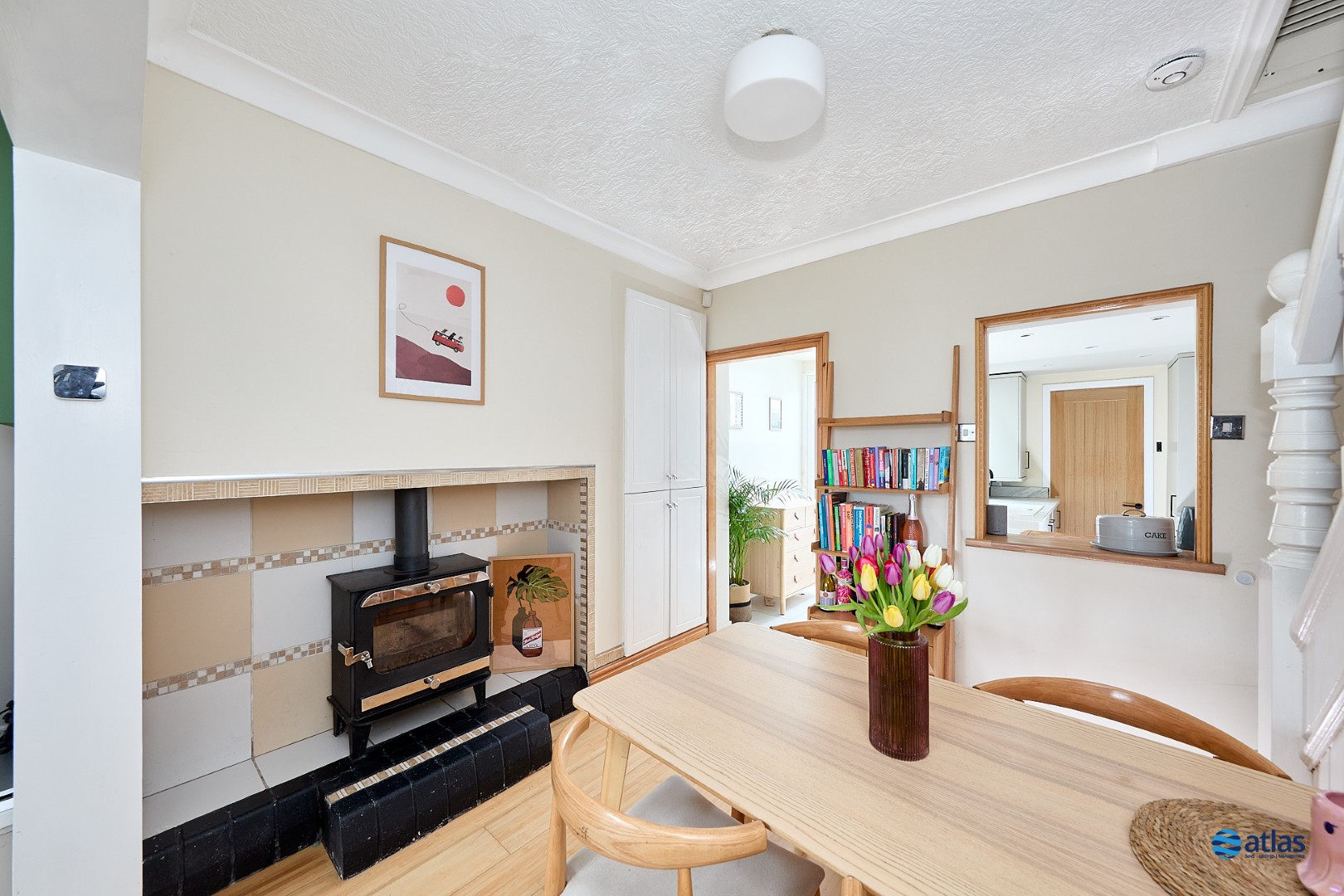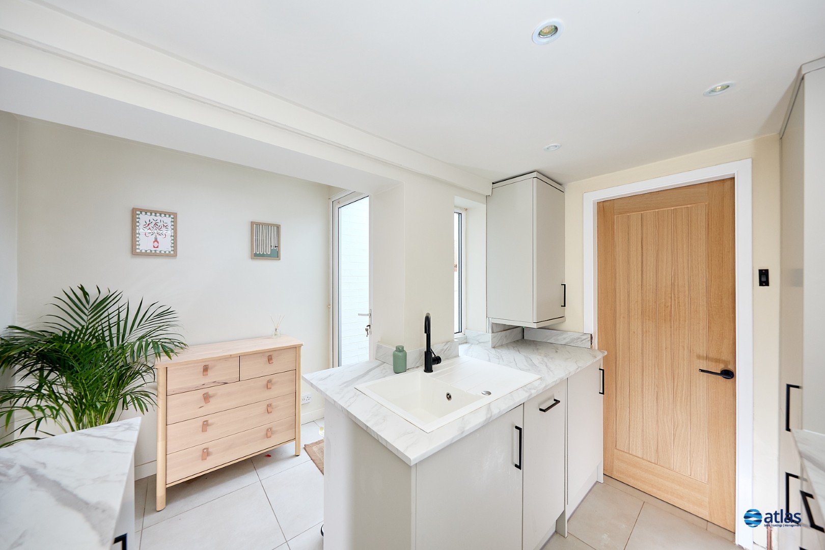 The heart of the home is a bright and spacious open-plan living and dining area, featuring a striking log burner alongside a marble-surround gas fire, creating a perfect focal point for cosy evenings. Flowing seamlessly from this space, the contemporary newly fitted kitchen boasts sleek cabinetry and integrated Bosch appliances, making it ideal for both entertaining and everyday living.