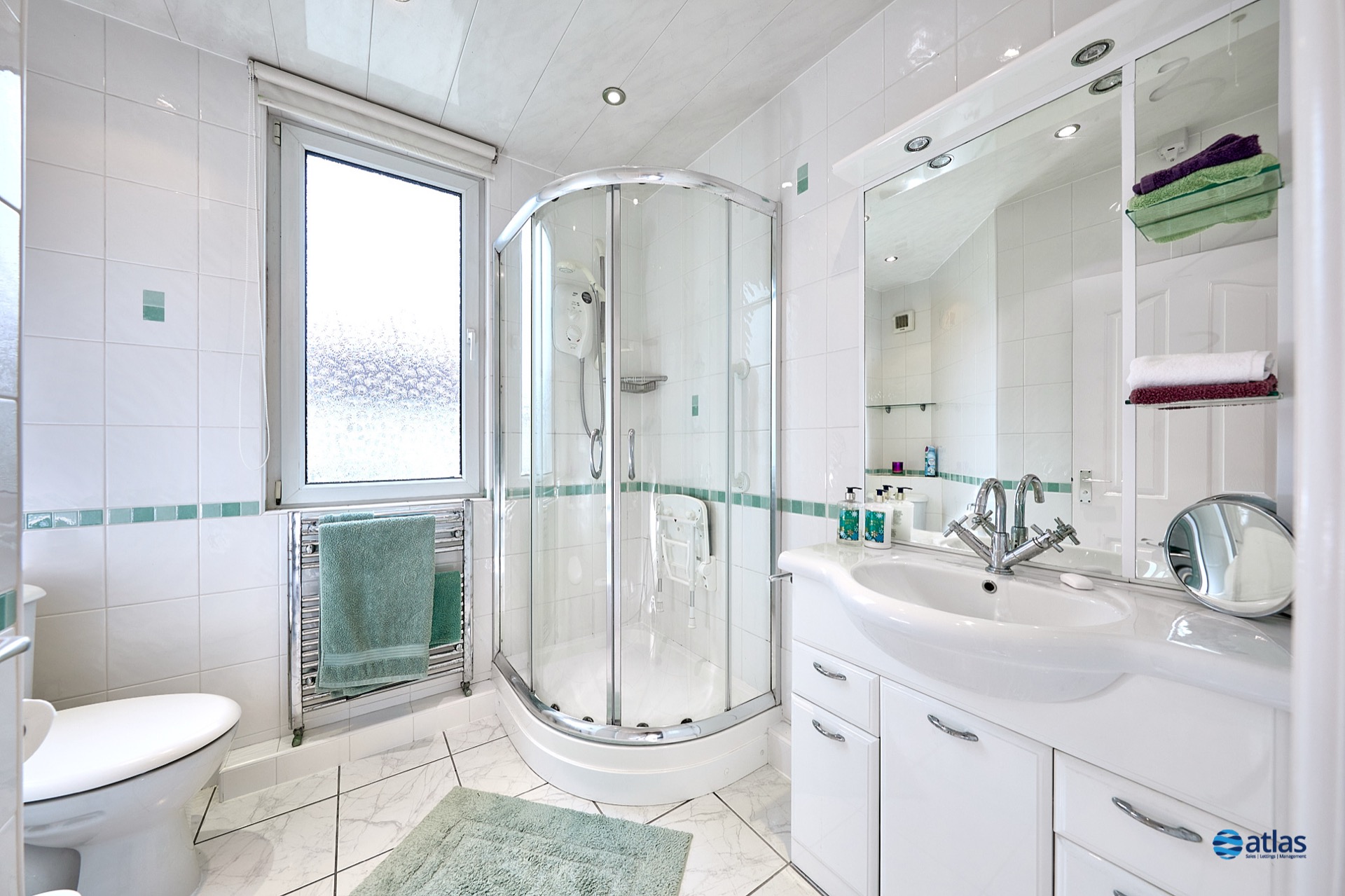 - Fully Tiled Bathroom Featuring a Quadrant Shower Enclosure