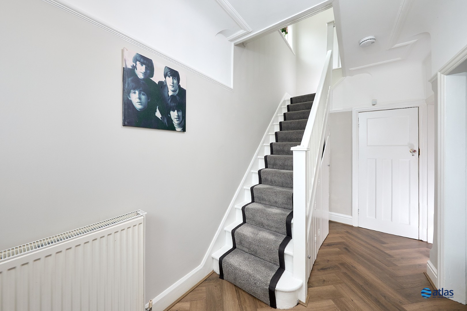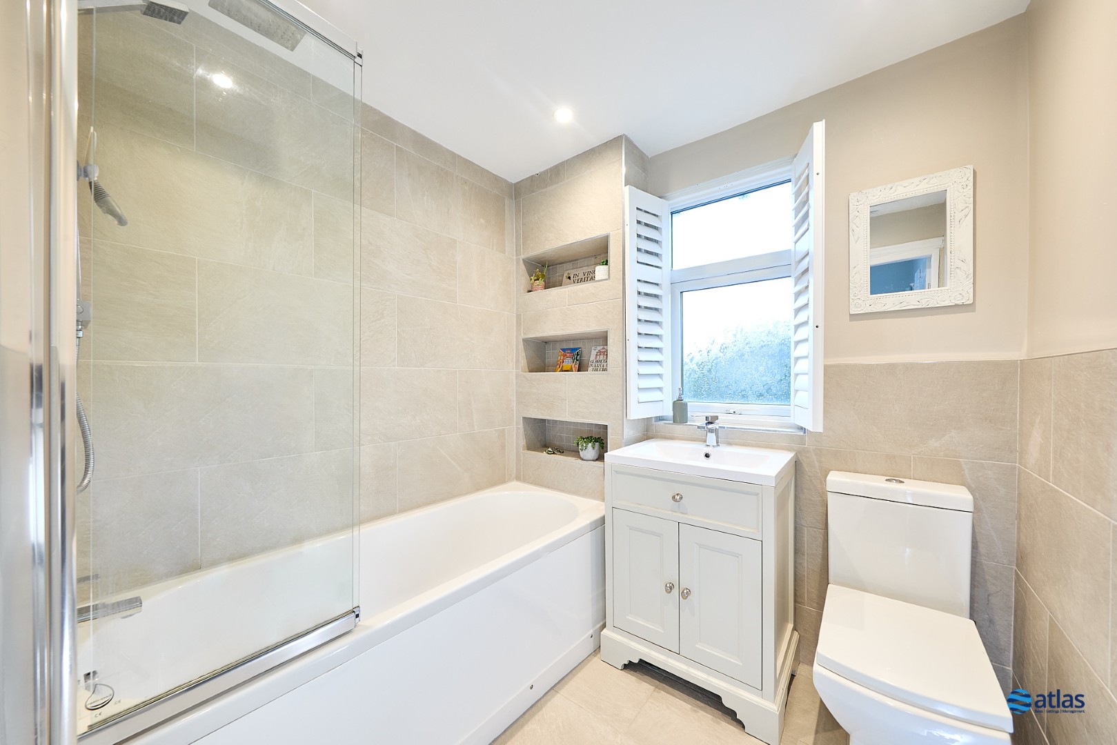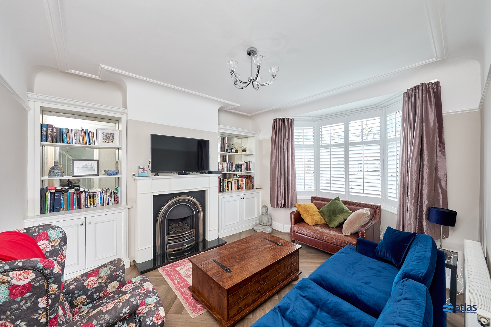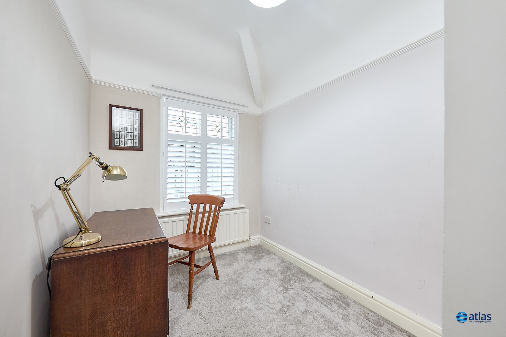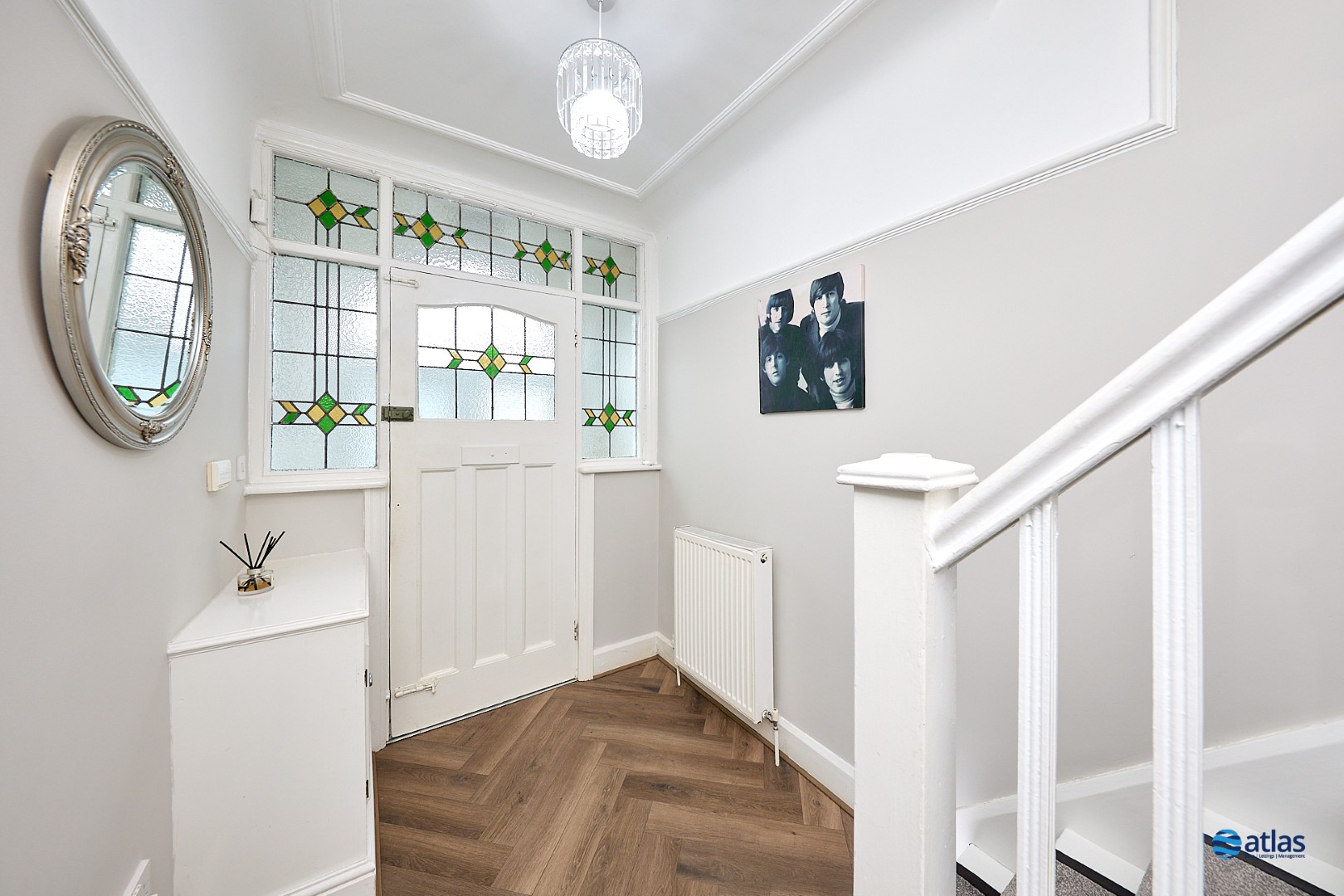 Upstairs, three well-balanced bedrooms offer comfortable accommodation, complemented by a stylish modern bathroom fitted with a bath and overhead shower. The property has been recently redecorated throughout, yet retains beautiful original stained-glass features to the front door and landing window, adding a subtle nod to its heritage. White plantation shutters dress all front-facing rooms, as well as the bathroom and rear bedroom, creating a clean, elegant finish.