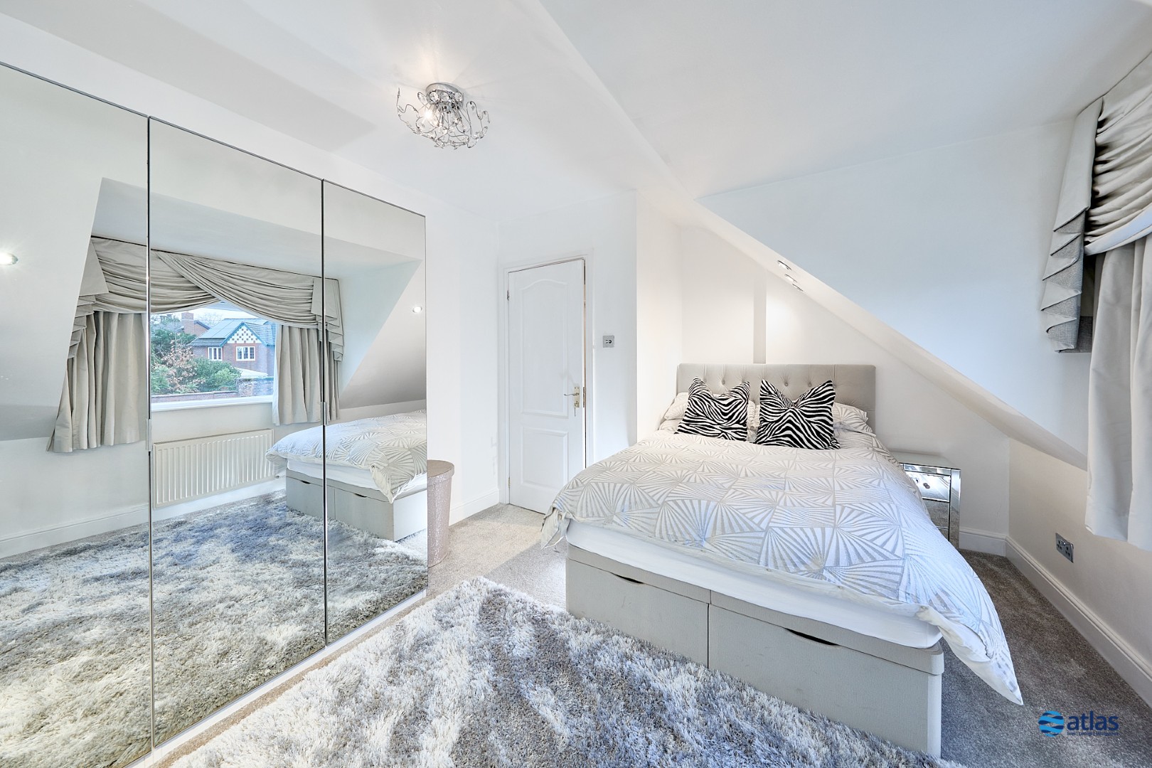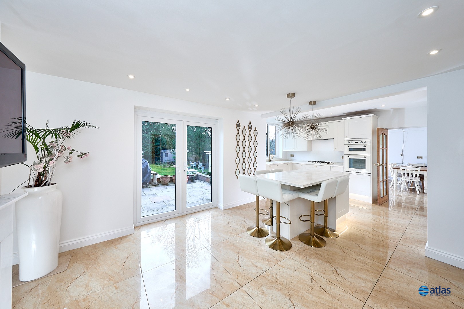 At the heart of this home lies a stunning bespoke kitchen with a striking central island and built-in pantry—an ideal hub for culinary pursuits and social gatherings. Flowing seamlessly from the kitchen are two beautifully appointed reception rooms, including a formal lounge featuring elegant French doors that open directly onto the expansive, south-facing landscaped rear garden. This outdoor haven, measuring approximately 30 x 20 metres, boasts a large patio measuring 18 x 5 metres for entertaining and a bespoke bar, creating the perfect backdrop for summer soirées.