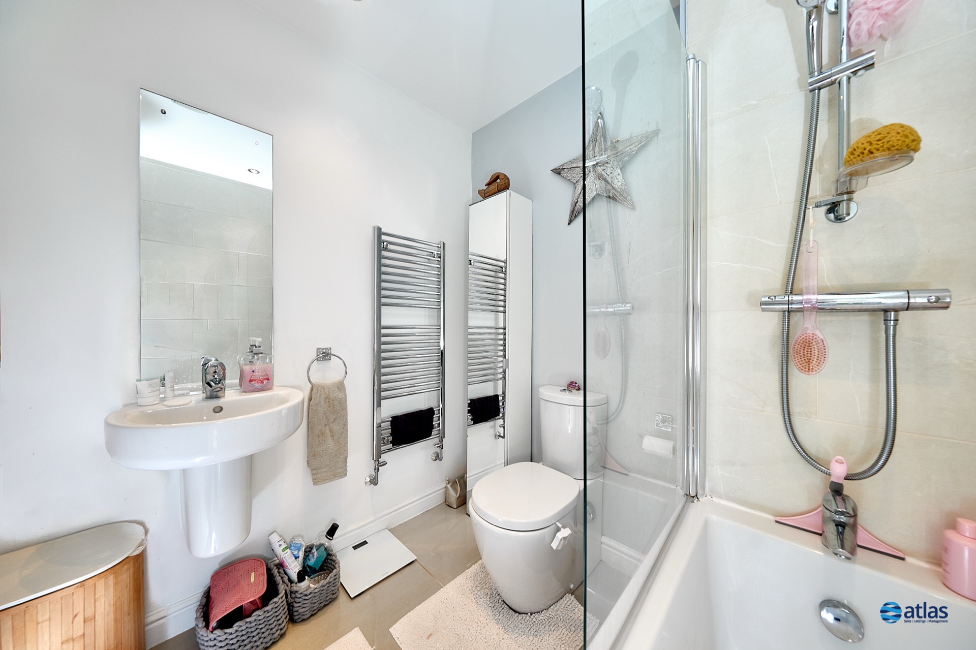 Upstairs, two well-proportioned bedrooms feature fitted wardrobes, complemented by a modern family bathroom with bath and overhead shower.