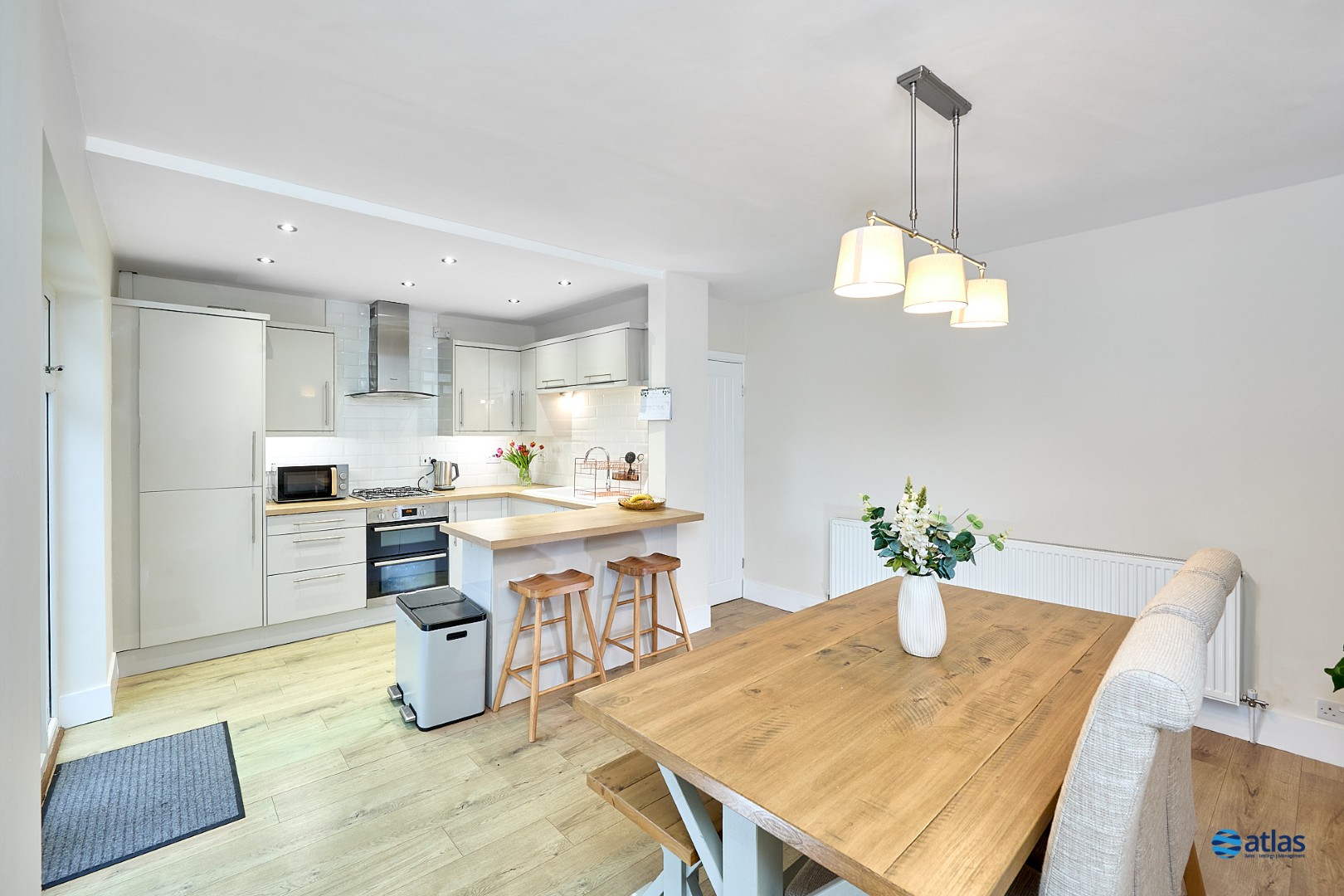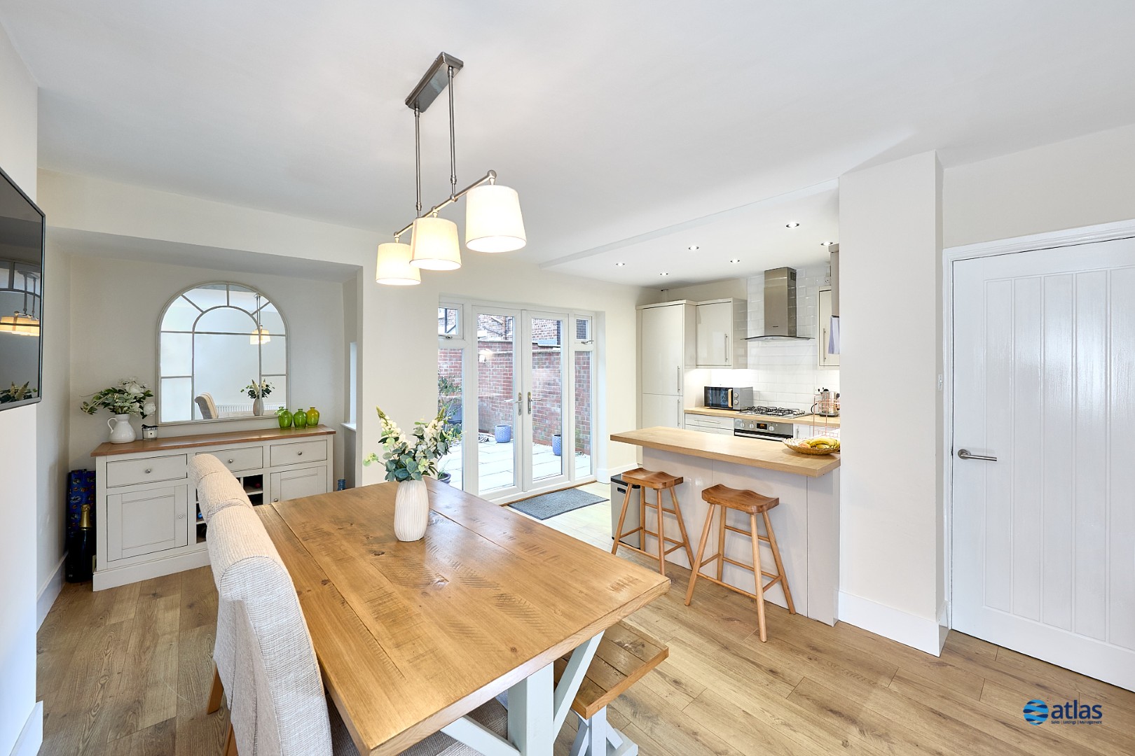The hallway sets the tone with its stylish wall panelling, adding a touch of charm and refinement. To the rear, the heart of the home unfolds: a spacious open-plan kitchen and dining area designed with modern living in mind. The bright, fitted kitchen features an electric oven and gas hob, sleek cabinetry, and generous worktop space, making it both practical and effortlessly elegant. French doors open out to the yard, creating a natural extension for entertaining in the warmer months.