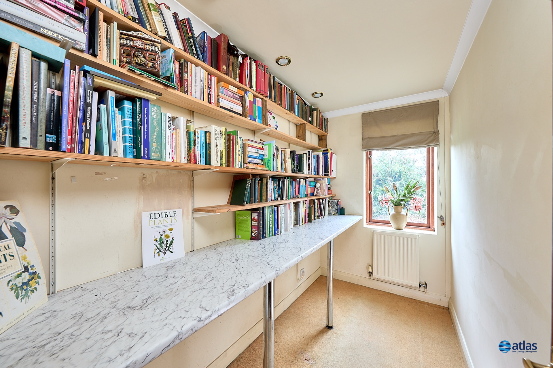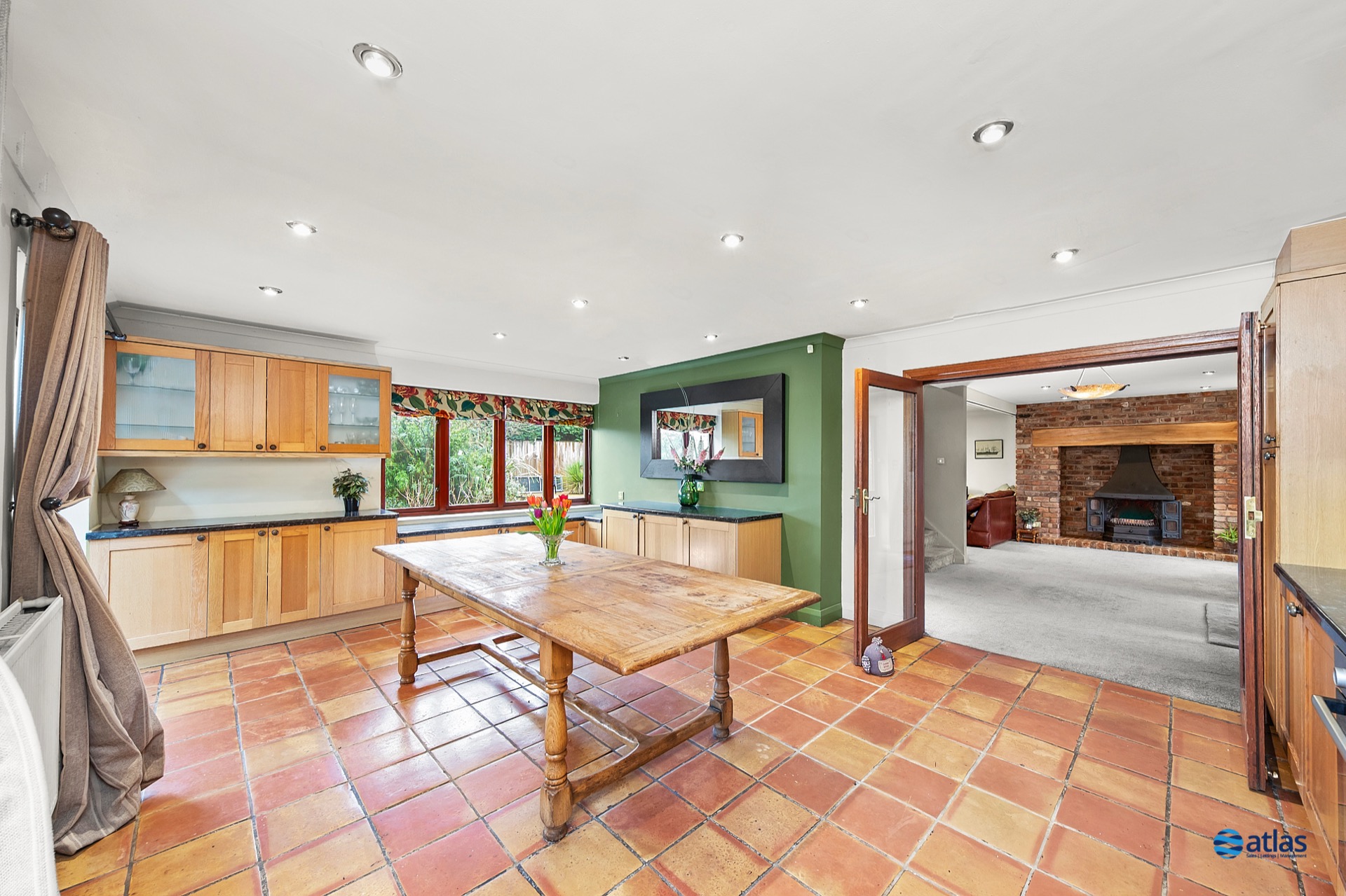 The bright and expansive kitchen is perfectly positioned at the rear of the property, with double French doors opening directly onto the garden, allowing natural light to flood the space and seamlessly connecting indoor and outdoor living. A private downstairs study offers an excellent work-from-home solution, complemented by a convenient ground floor W.C. and a dedicated utility room to keep household essentials neatly organised.