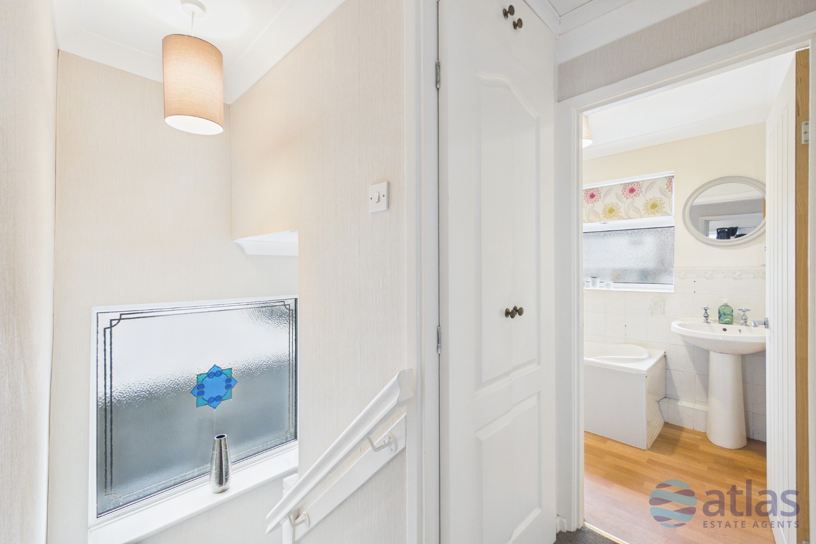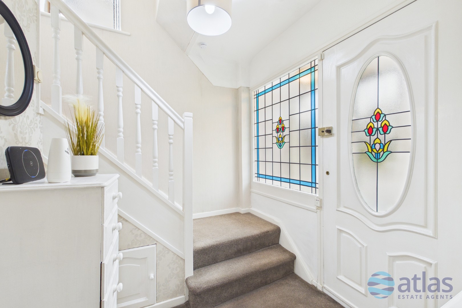 The kitchen has been thoughtfully designed with integrated appliances and a breakfast bar, while a convenient ground-floor shower room adds practicality to the layout. Upstairs, the three bedrooms are bright and airy, served by a contemporary family bathroom, with attractive feature stained glass windows adding a touch of character throughout.