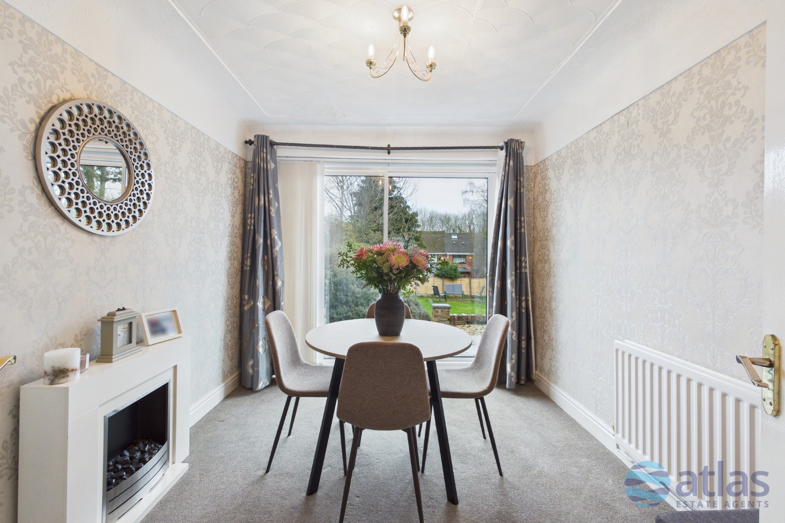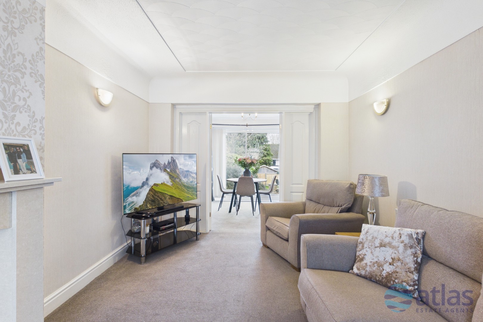Set over two well-proportioned floors, the accommodation comprises a spacious reception room, a separate dining area, a modern fitted kitchen, three generously sized bedrooms, and two bathrooms. The reception room, complete with a feature fireplace and fitted carpet, flows seamlessly into the dining room, which is elegantly separated by stylish bi-folding doors—perfect for entertaining or family life.