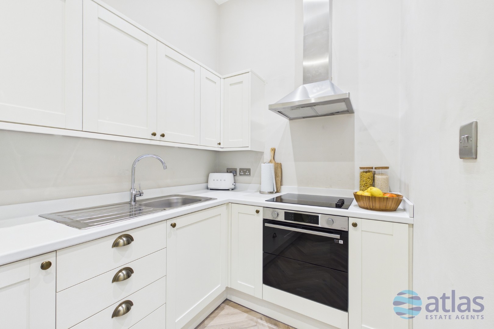 - Sleek Kitchen Featuring Elegant Herringbone Flooring and Integrated Appliances, Including Fridge, Freezer, Electric Oven, and Hob.