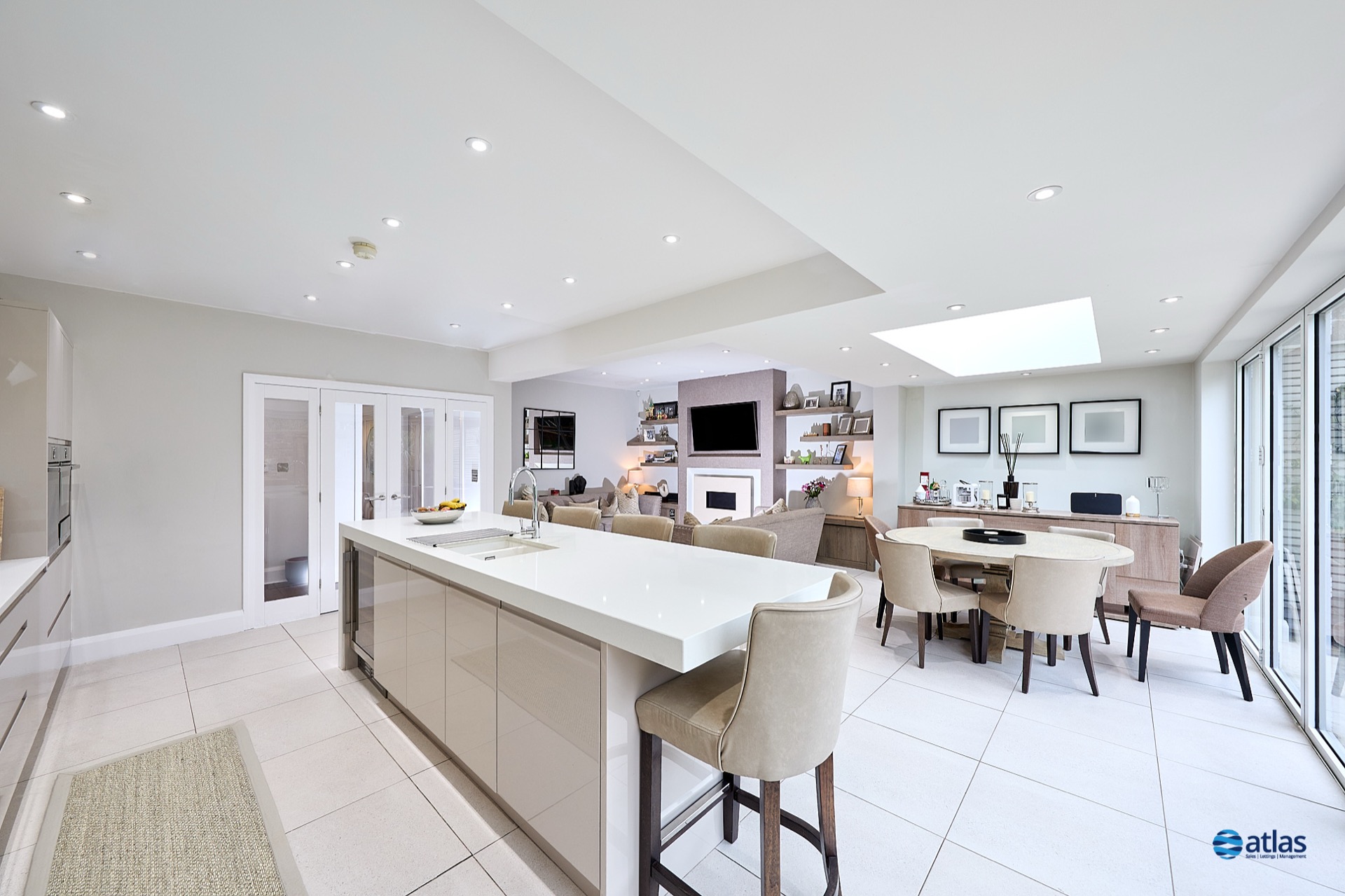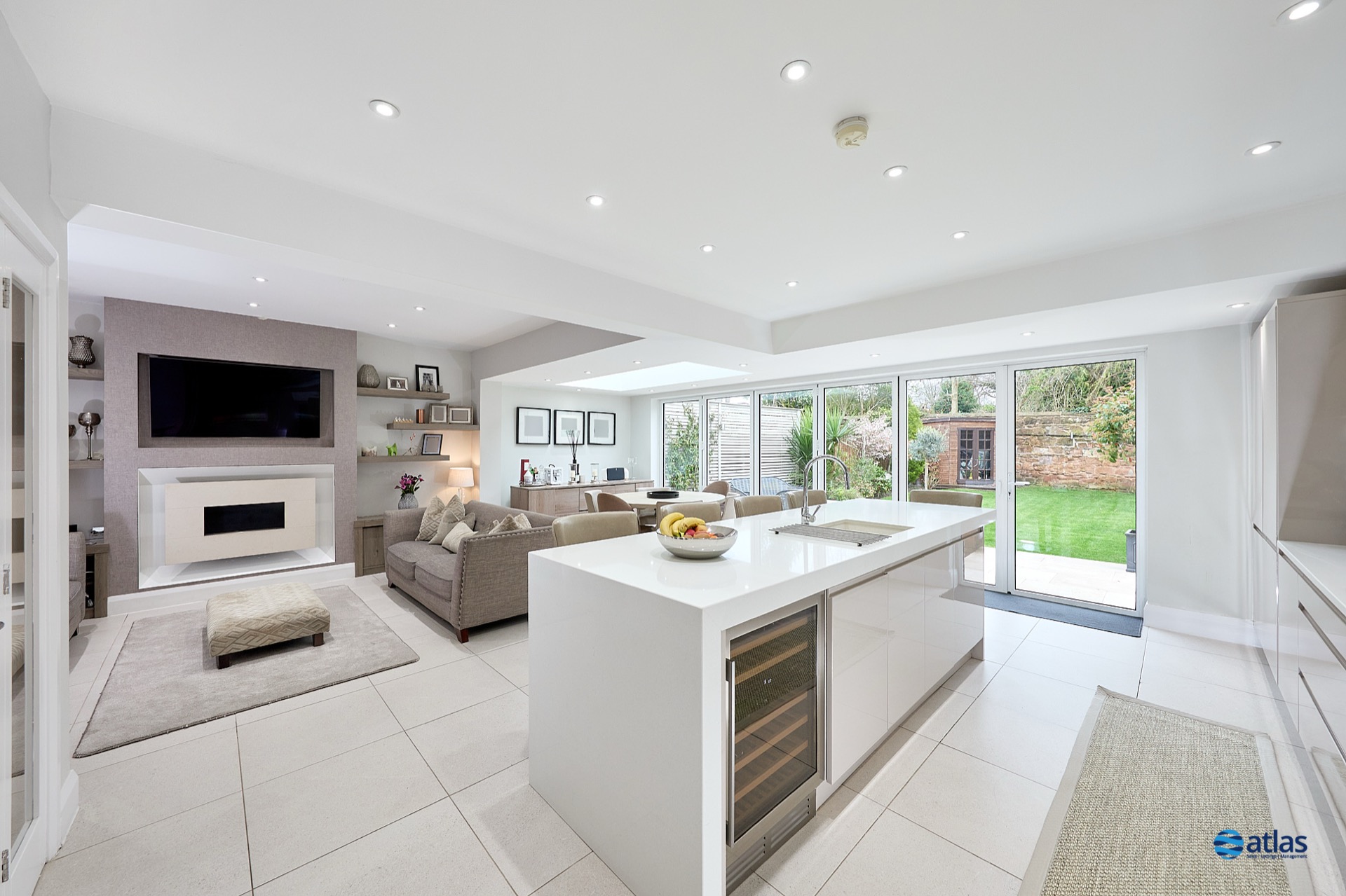 - Spacious, Open-Plan Kitchen, Dining and Living Area Complete with Integrated Appliances and Media Wall
