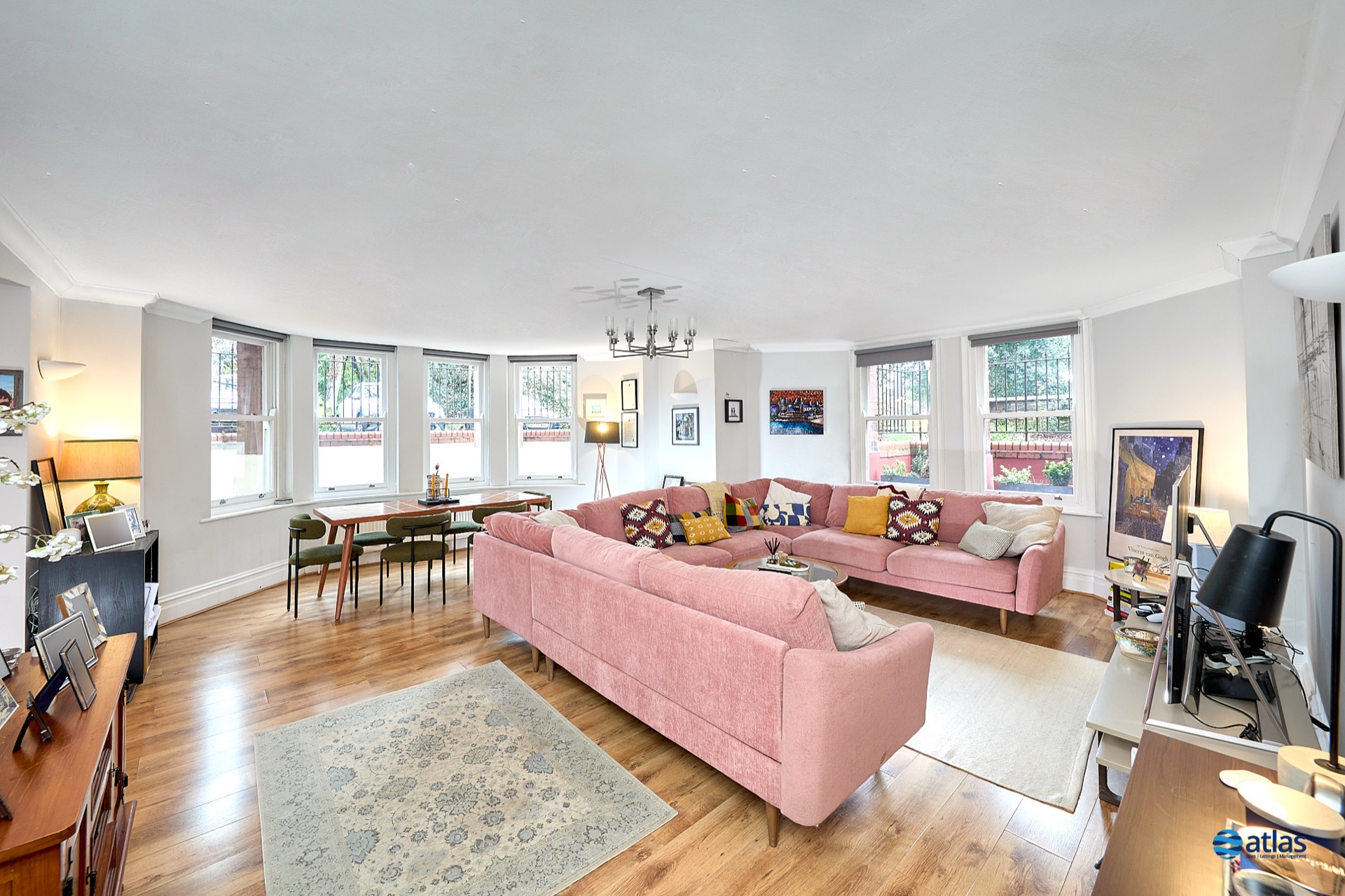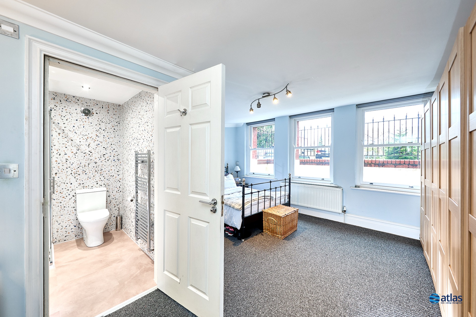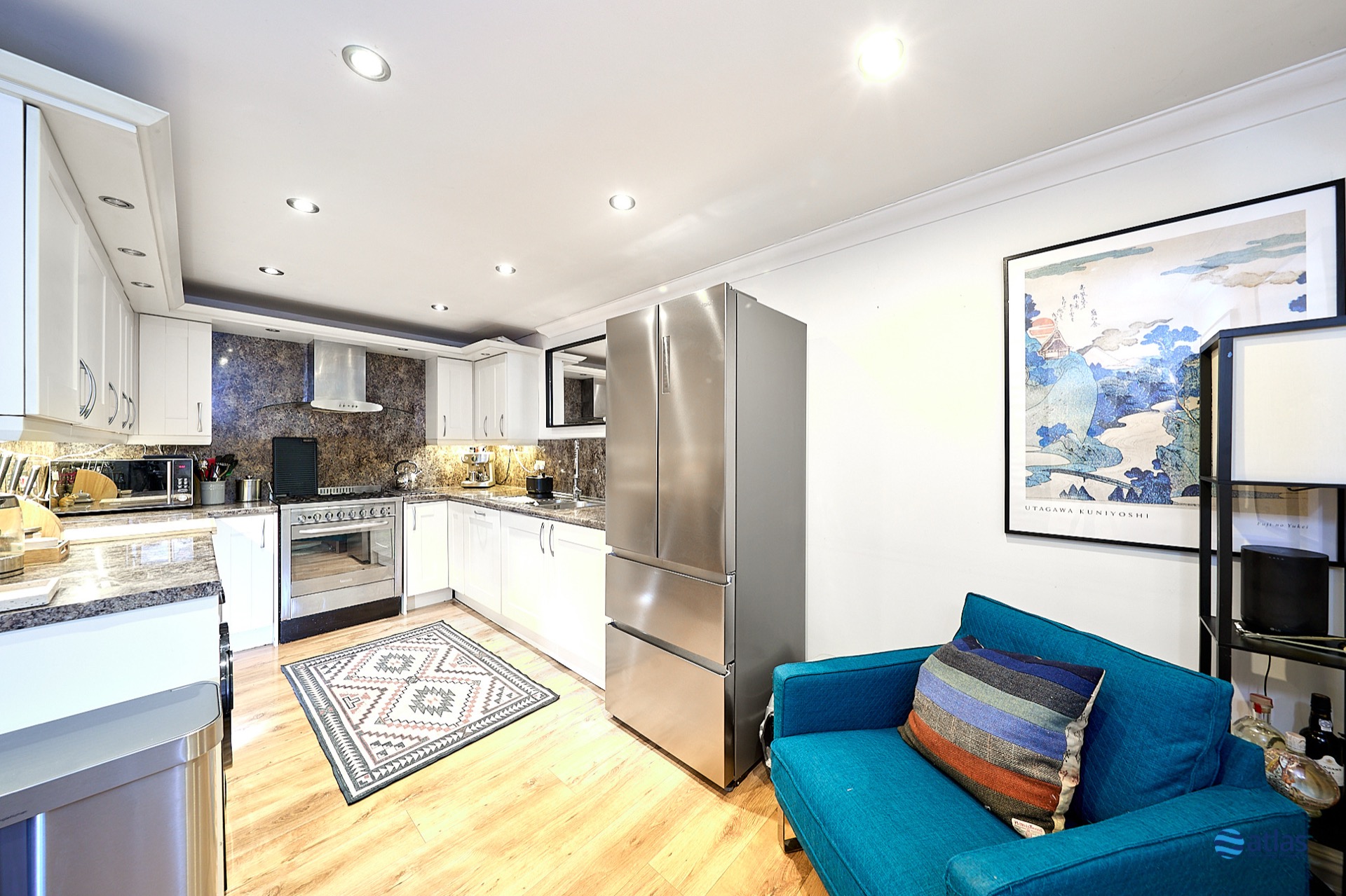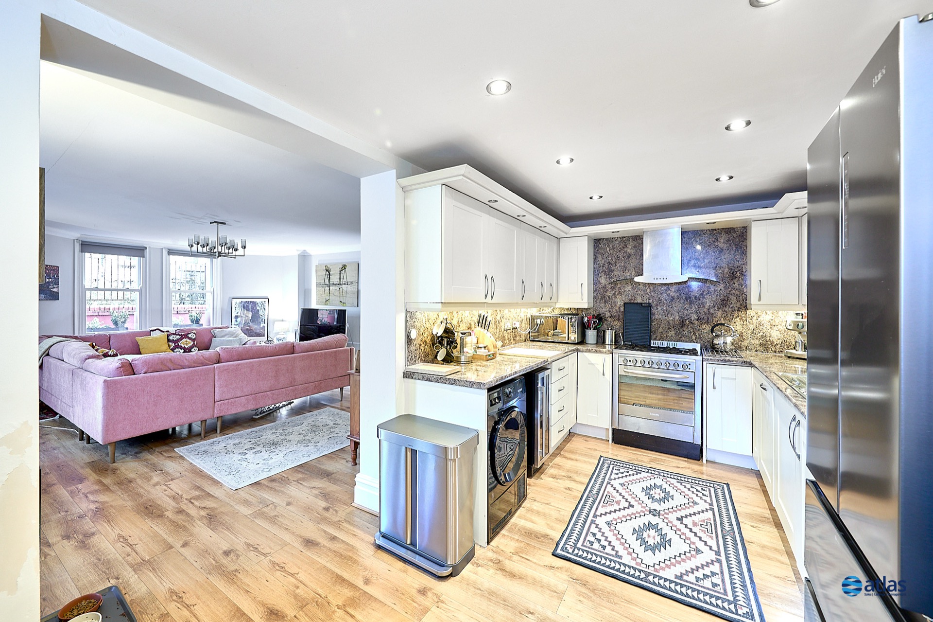 Accessed via its own private front door, the property opens into a generous and thoughtfully arranged interior set across a single floor. At its heart lies a spacious open-plan kitchen, dining and living area—perfect for both relaxing and entertaining. The modern kitchen is well-equipped, featuring sleek fittings and an integrated dishwasher, while traditional sash windows flood the space with natural light and add a touch of timeless elegance.