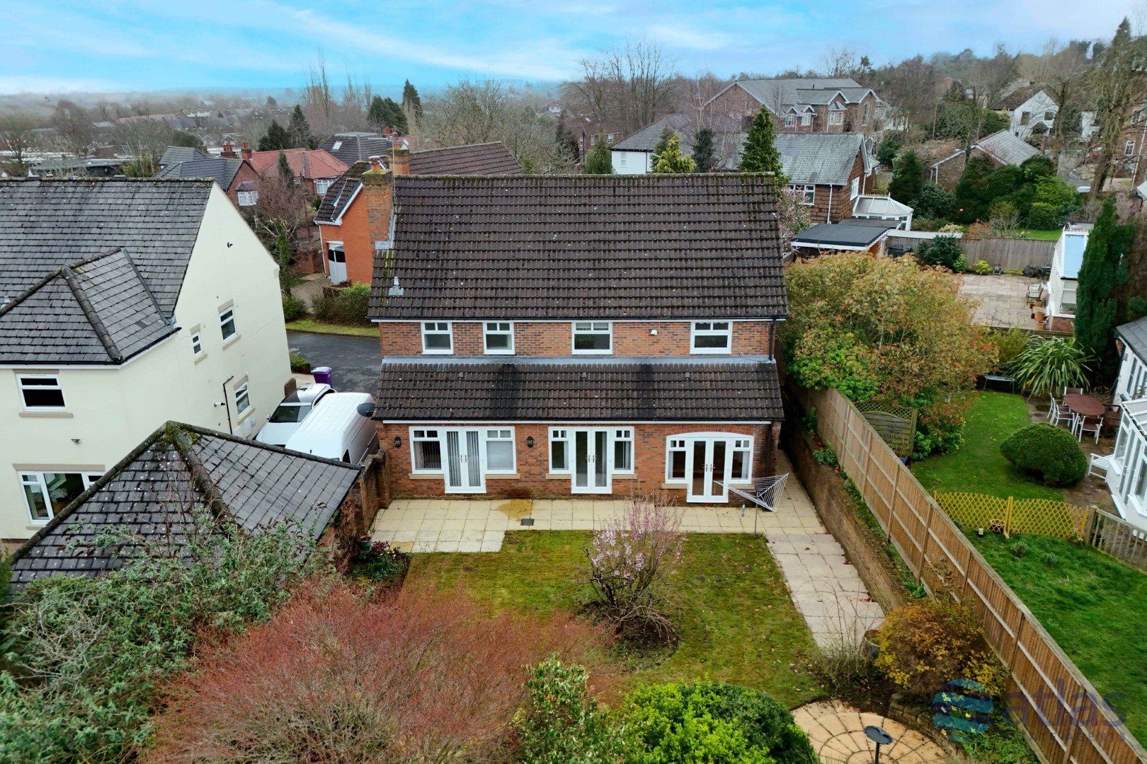 Upstairs, there are four well-proportioned bedrooms, all with fitted wardrobes and plush carpet, alongside three bathrooms, including two stylish en-suites, providing ample convenience for family living.