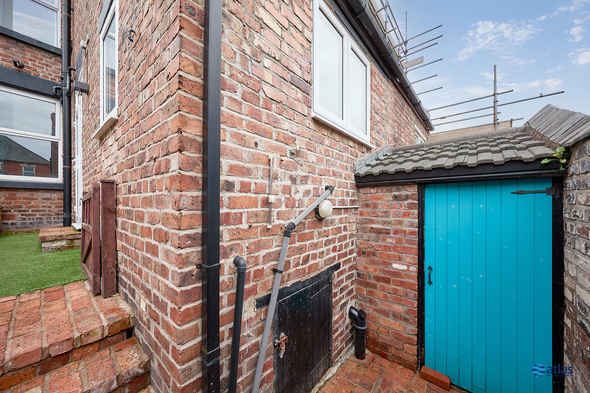 - Modern Patio Doors Leading Out to the Rear Yard, with Steps Leading Up to a Small Shed Providing Useful Storage