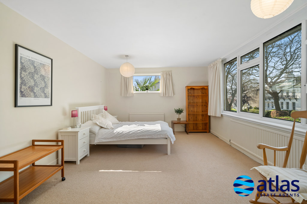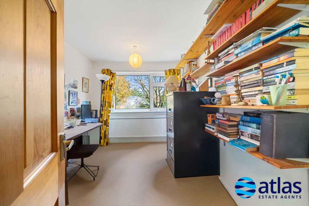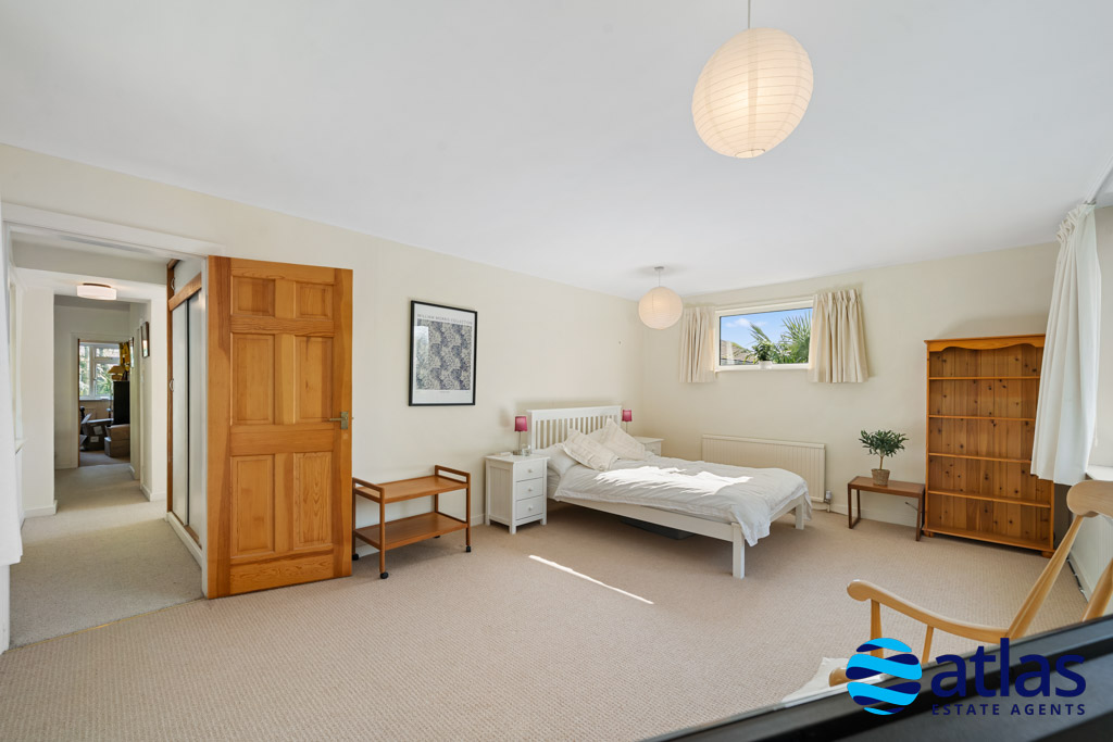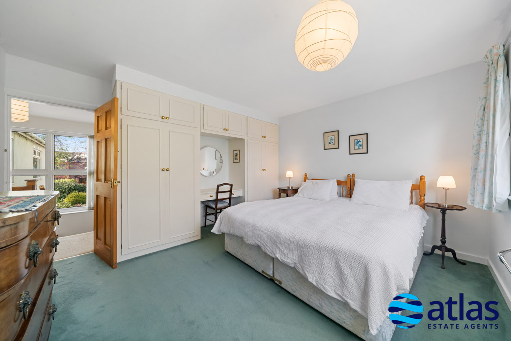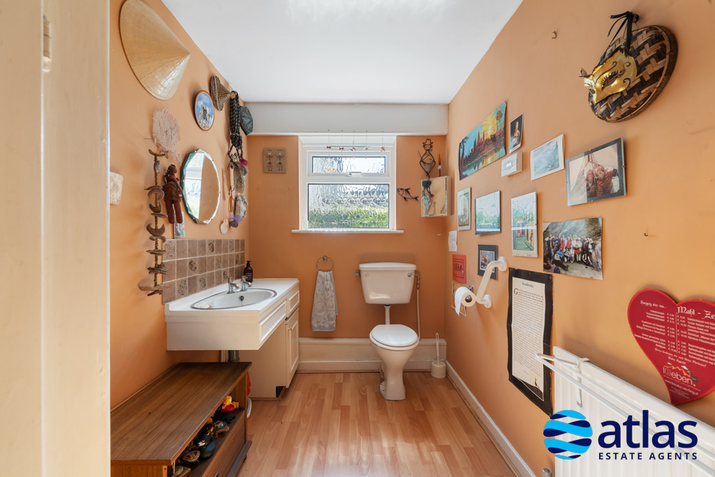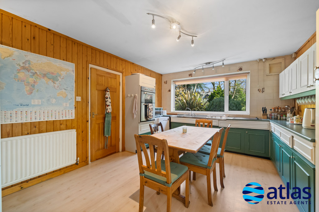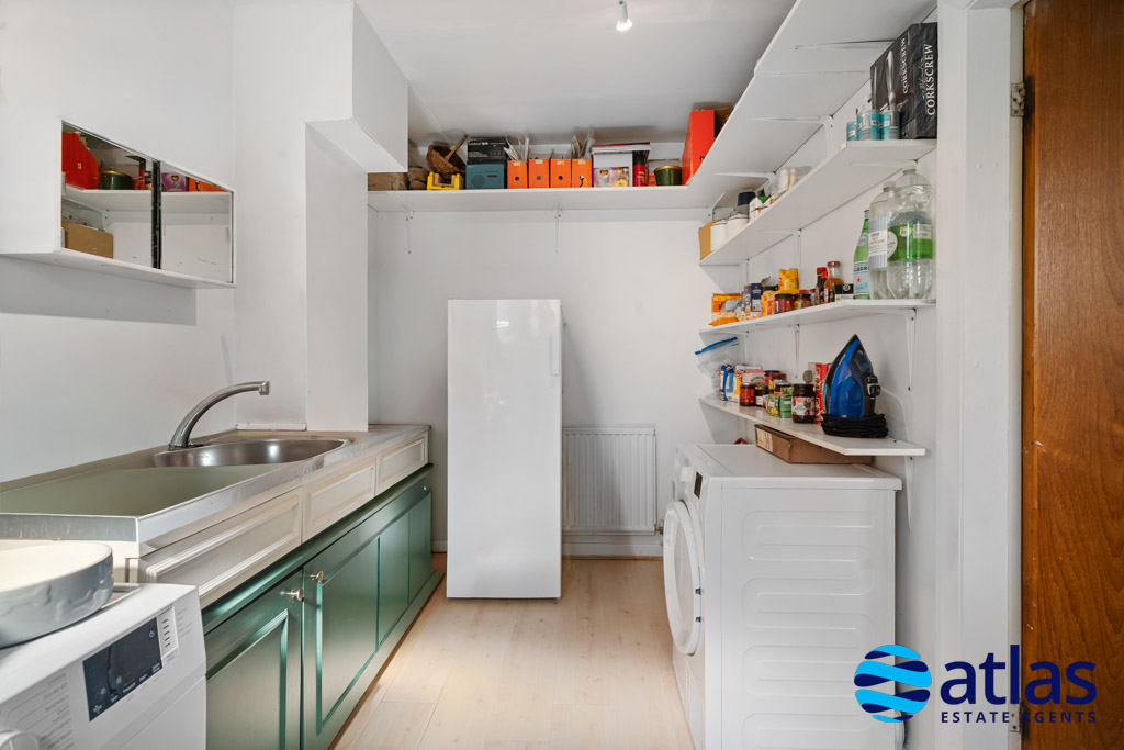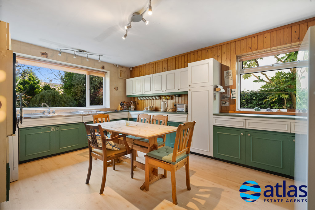 There are two well-proportioned reception rooms, including a dining room with built-in storage that flows into a bright living area overlooking the garden with direct access outside. An expansive second lounge leads through to a sizeable kitchen, retaining charming original features, complemented by a separate utility room with convenient side access to the rear garden.