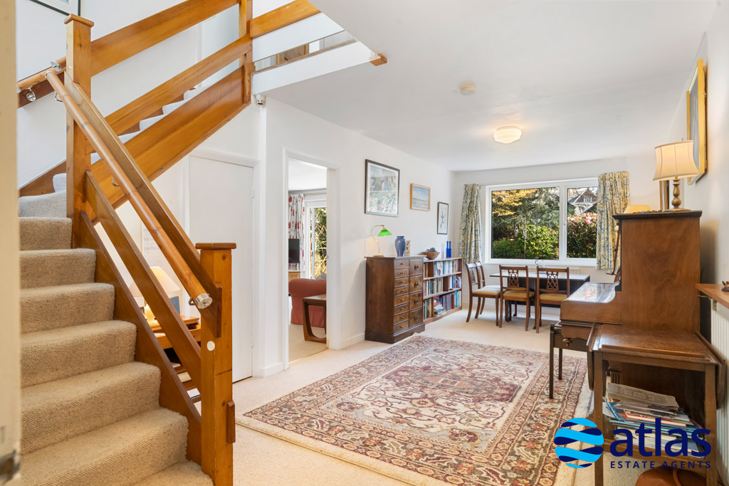 Set back from the road behind a generous driveway with parking for up to five vehicles, the property offers a striking first impression and a sense of privacy. A welcoming, light-filled entrance hall with ground floor WC sets the tone for the spacious accommodation arranged over two floors.