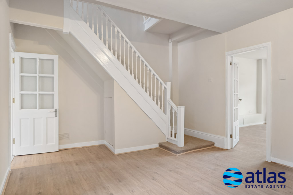 A welcoming entrance hall sets the tone, leading into a bright and spacious front reception room where large windows invite an abundance of natural light and offer pleasant front aspect views. To the rear, a second reception room provides an adaptable living and dining space, complete with views over the rear yard and access to the staircase rising to the first floor.