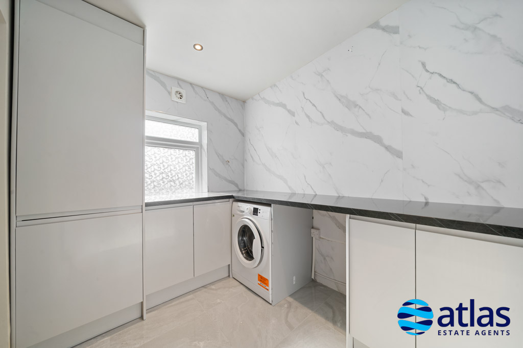- Separate Spacious Utility Room Finished with Attractive Modern Tiling and Additional Storage and Workspace.