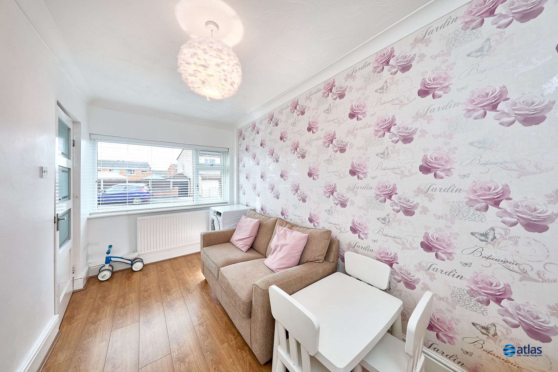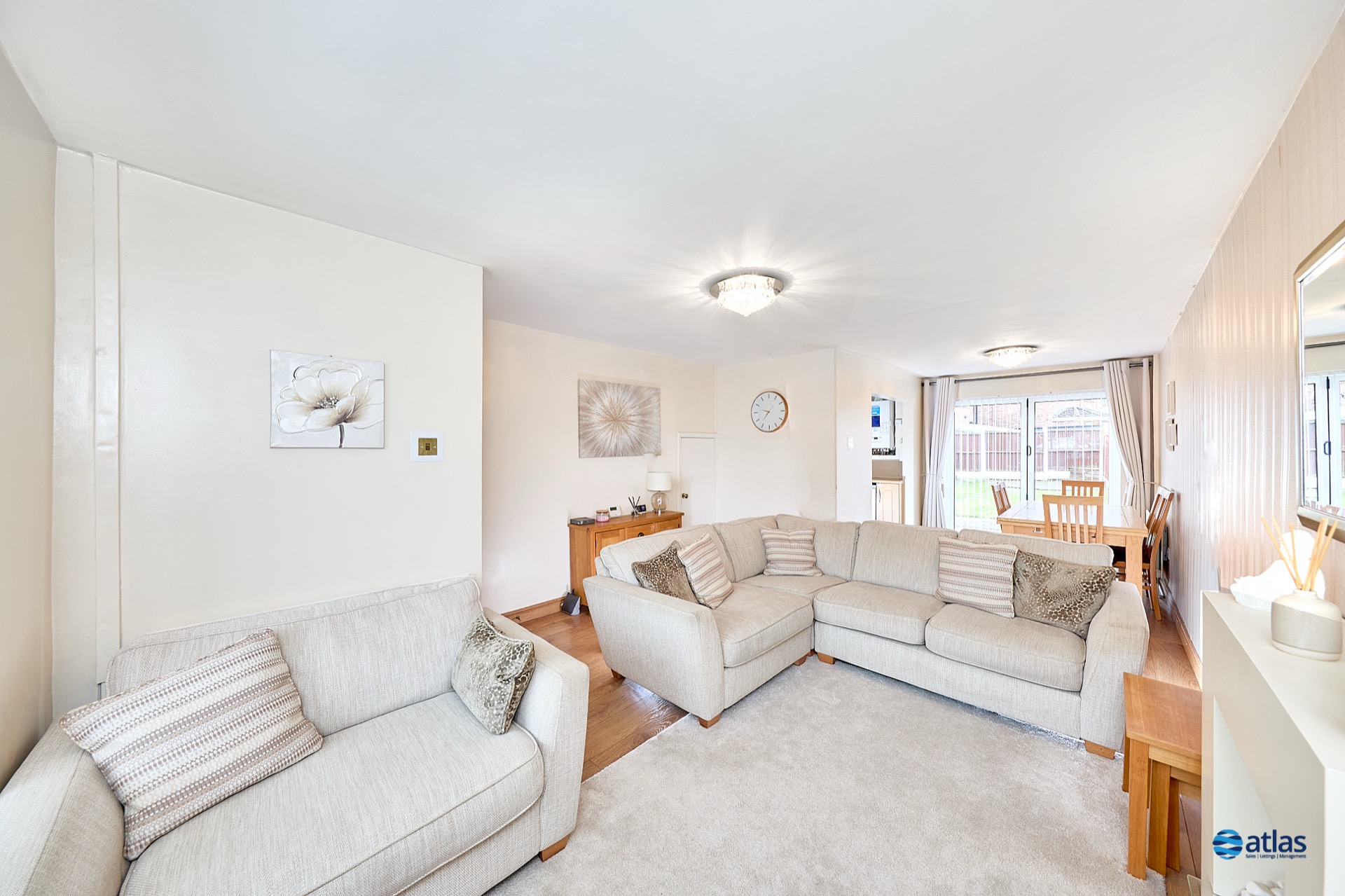 Set back from the road with a driveway providing off-road parking, the home welcomes you with a bright and inviting hallway. To the left, a private and generously sized living room offers a peaceful retreat, while to the right, a contemporary open-plan living and dining area provides a stylish and practical space for family life, opening onto the garden through patio doors. The well-designed kitchen, located off the dining area, offers an extended layout with ample workspace and storage.