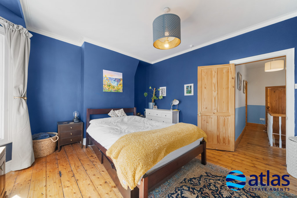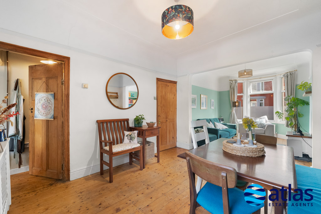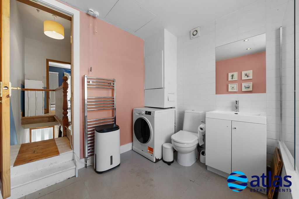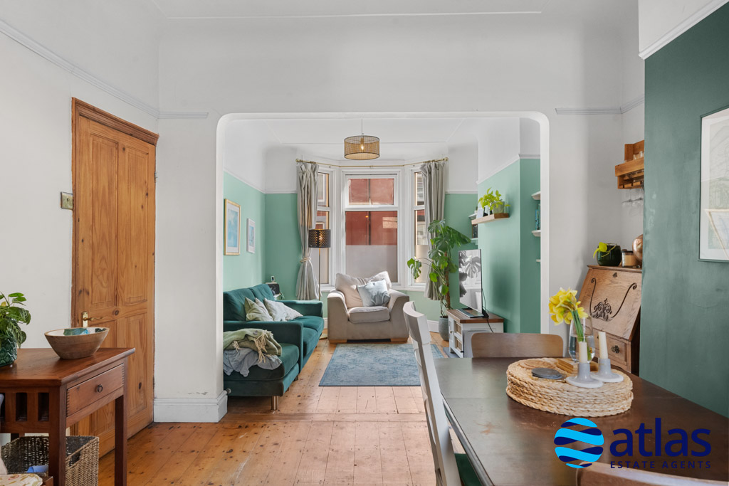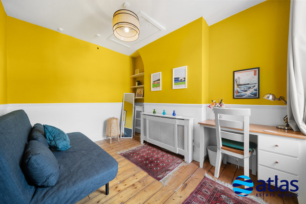 Upstairs, there are two bedrooms, including a spacious master with a beautiful bay window and elegant Victorian-style column radiator, alongside a modern family bathroom with bath and overhead shower.