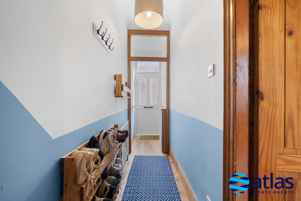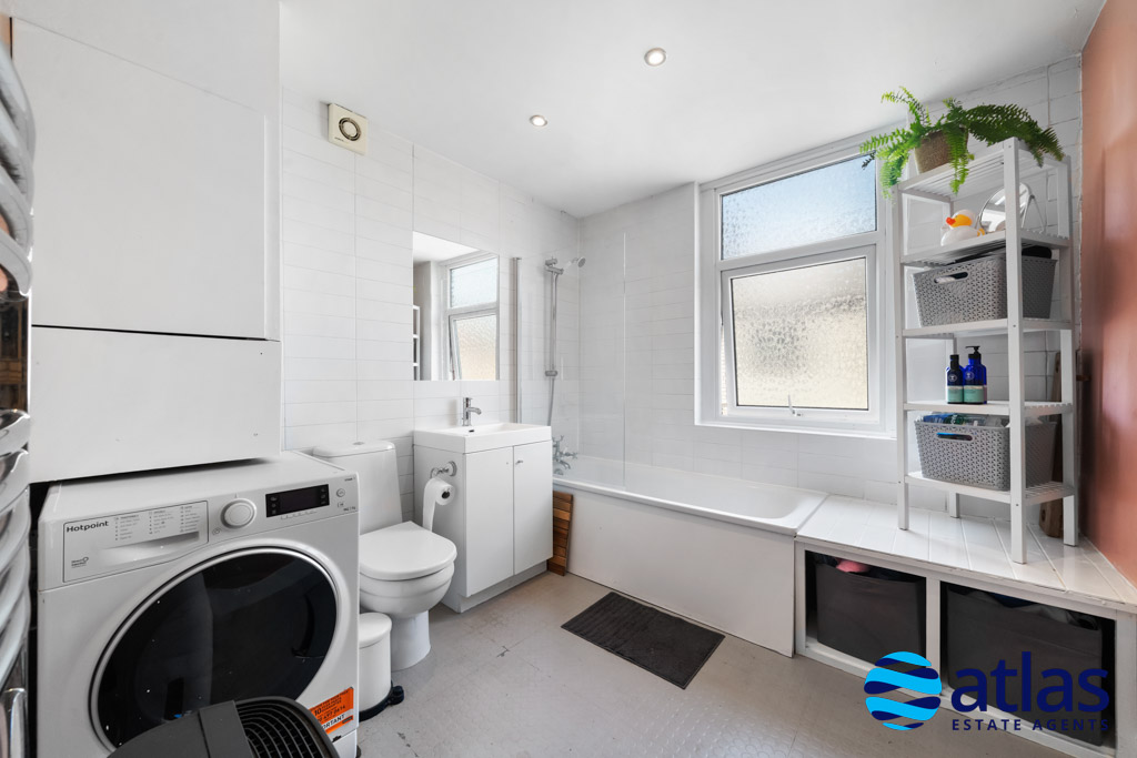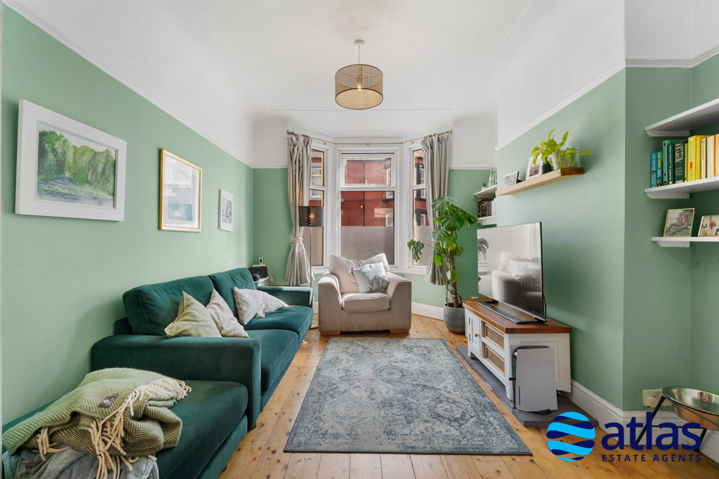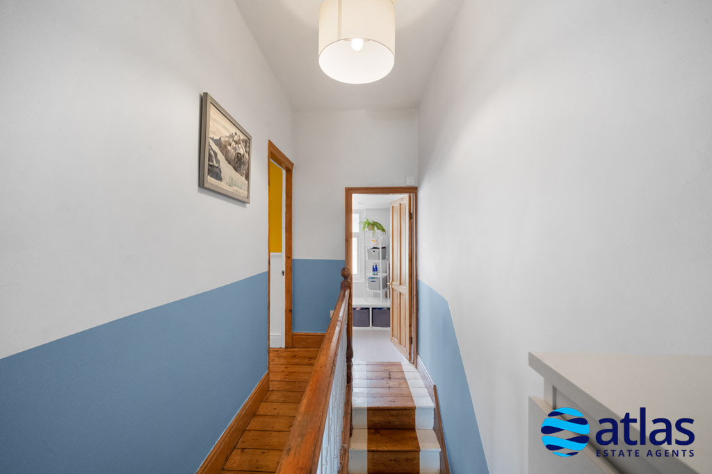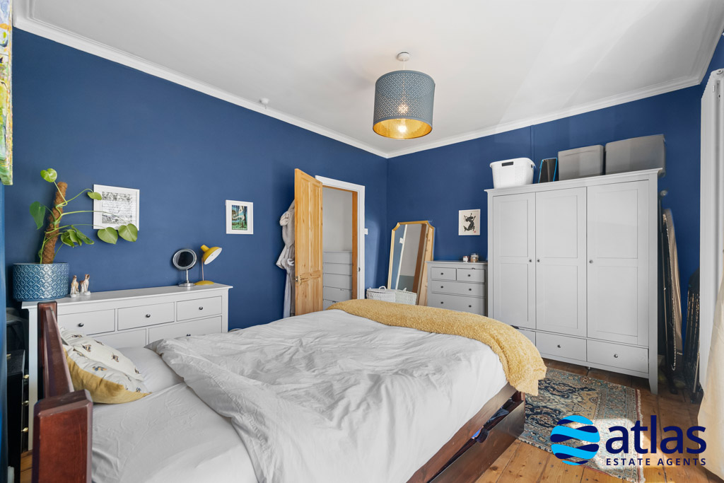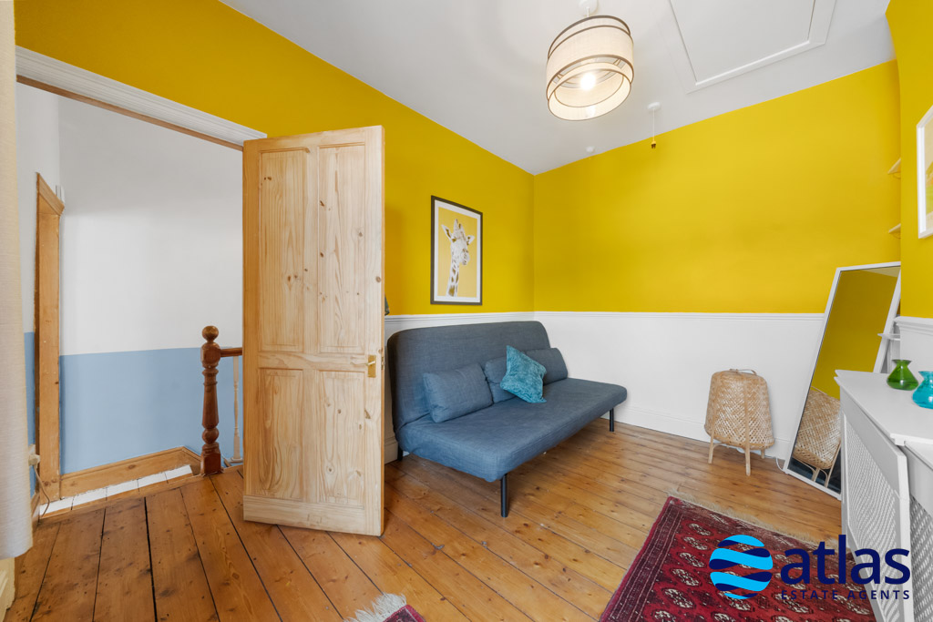 Upstairs, there are two bedrooms, including a spacious master with a beautiful bay window and elegant Victorian-style column radiator, alongside a modern family bathroom with bath and overhead shower.