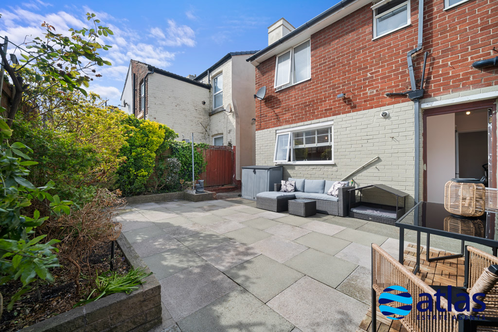To the rear, a sleek and modern kitchen offers both style and functionality, flowing seamlessly into a compact yet highly practical utility space. From here, you can access the generous rear yard, which has been thoughtfully designed with a patio seating area and greenery—perfect for relaxing or entertaining.