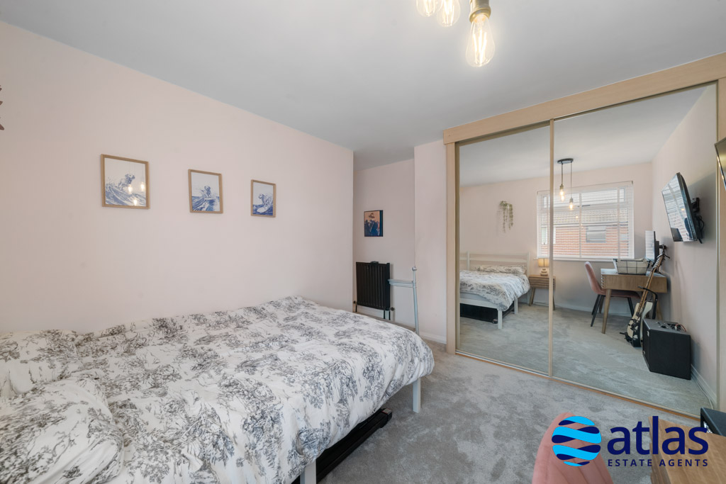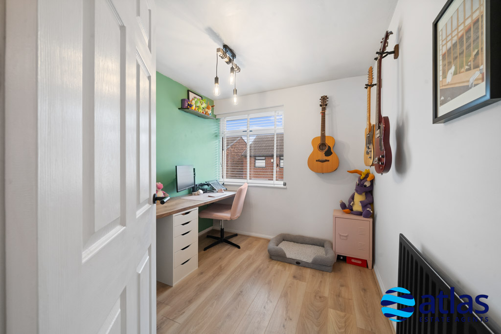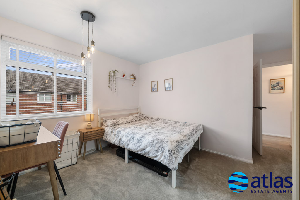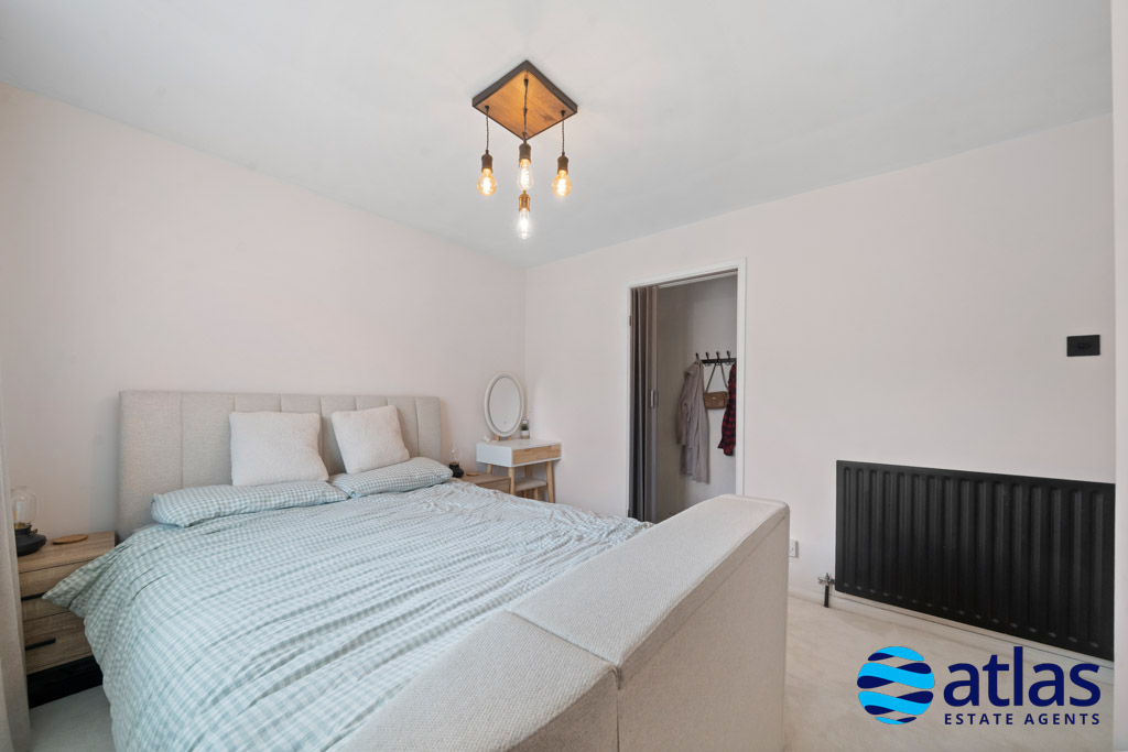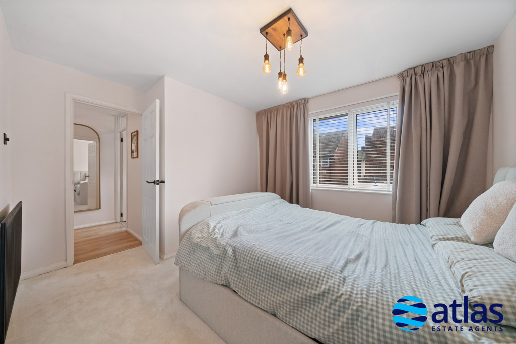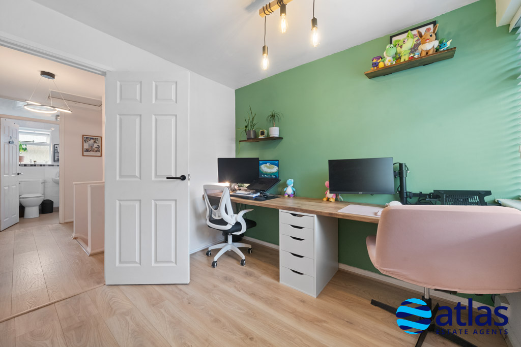 Upstairs, a spacious landing leads to three well-proportioned double bedrooms. The principal bedroom benefits from a walk-in wardrobe, while the second bedroom features fitted wardrobes, providing excellent storage. A modern shower room, finished to a high standard, completes the first floor.